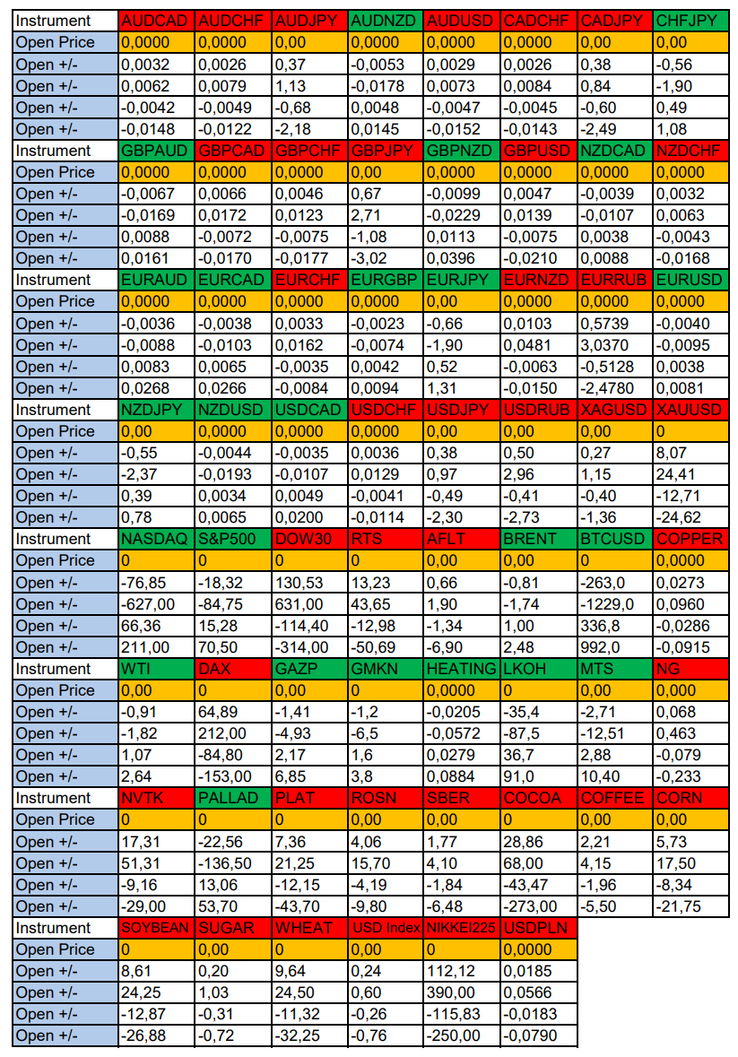 Весь перечень анализируемых активов указан ниже в общем количестве 62 инструмента. Здесь Вы найдете активы рынка Форекс, популярные активы Московской биржи, не менее популярные активы Чикагской биржи СМЕ и мажор криптовалютного сегмента - Биткоин, за которым следуют все альткоины.