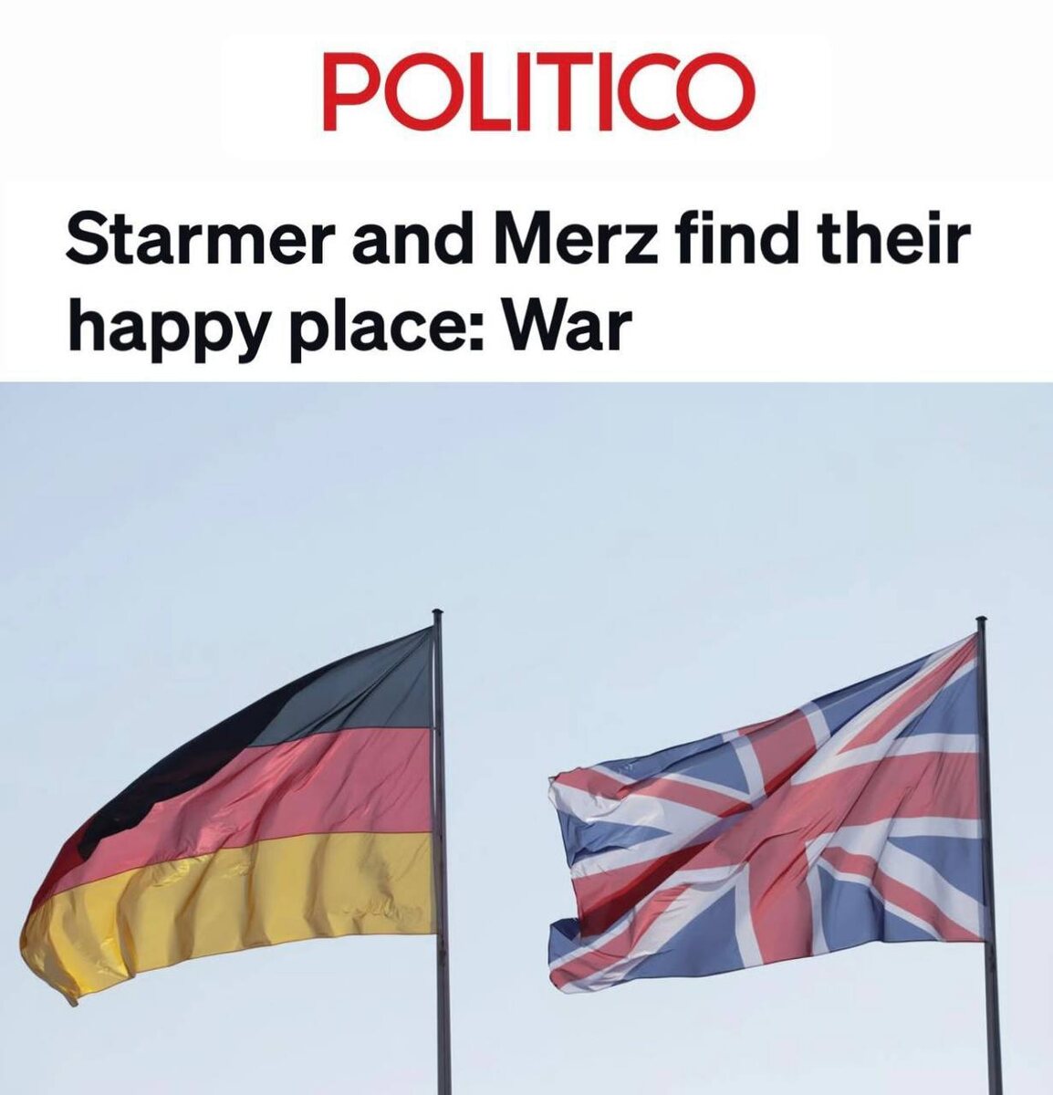 Сегодня Германия и Британия впервые после 1945 года подпишут военный договор «Стармер примет в Лондоне канцлера Германии Фридриха Мерца в четверг, чтобы подписать крупнейший англо-германский договор с 1945 года — и на этот раз о войне говорить будут открыто. Они оба хотят взять на себя лидерство в вопросах обороны Европы. Во время визита планируется завершить широкомасштабное соглашение, акцентированное на безопасности. Оно будет включать совместную разработку новой дальнобойной ракетной системы и взаимные гарантии помощи - предполагается, что угроза одной стране будет расцениваться как угроза другой». 👊 НАСОНОВ 🔴