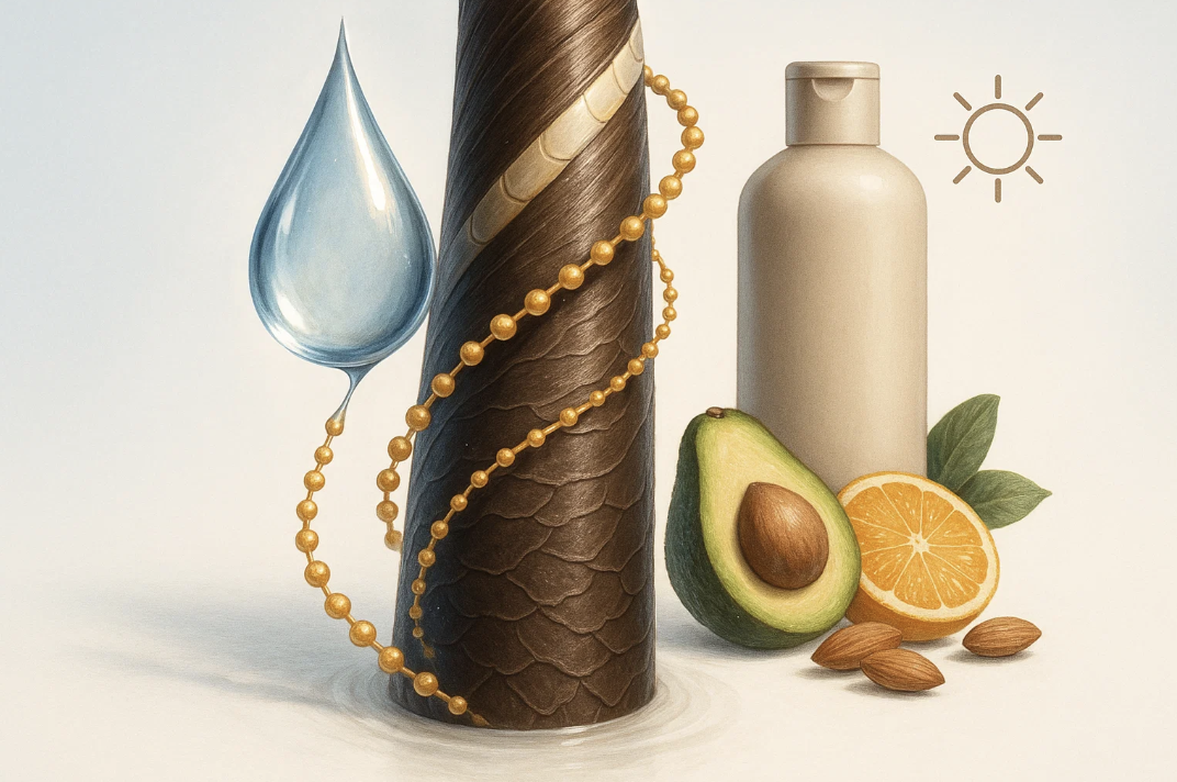 Верхний слой волоса (кутикула) защищает его. Если чешуйки кутикулы повреждены или приподняты, волос теряет воду, силу и блеск. Керамиды – это жиры, похожие на те, что есть в волосах от природы. Они помогают "склеить" чешуйки кутикулы, уплотняя волос и делая его гладким. Натуральные масла (арганы, кокоса, ши) также закрывают кутикулу, защищая волос от потери влаги и внешних воздействий.
