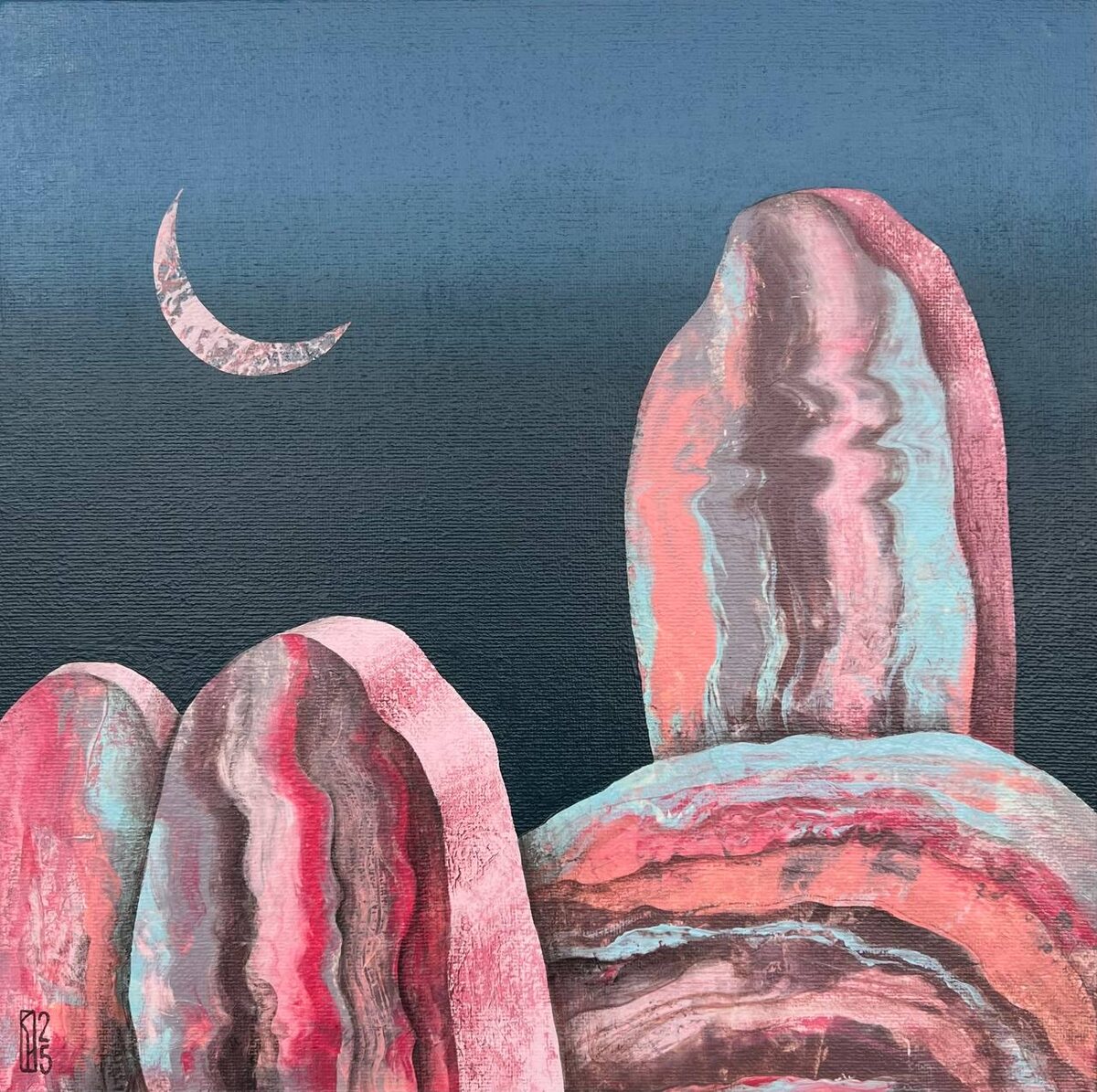 Наваждение 30х30 холст/акрил, коллаж 2025 ••• В работе «Наваждение» все внимание направлено на абстрактные живописные каменные структуры, которые подобны антропоморфным сущностям. Камни находятся в вечной пустоте ночи, что подчеркивает, тоже каменный, полумесяц луны. Структура минерала становится для зрителя наваждением, и погружает в размышления об устройстве Вселенной и возможно о тотальном одиночестве существ, живущих на летящих в космосе камнях. ••• Рассмотреть ценность «Драгоценностей» Натальи Порошиной в галерее YOLKA art можно до 10 августа. ••• Москва. Ходынский бульвар 20а, с 11:00 до 21:00 ежедневно. Выставка бесплатная, работы продаются. Вся контактная информация на сайте YOLKA.art