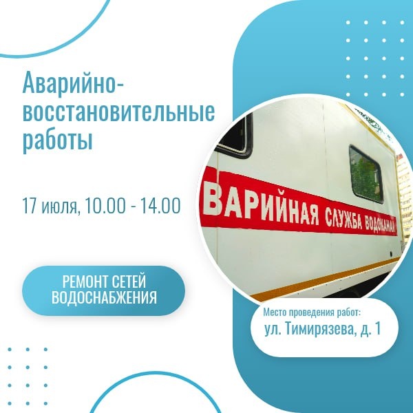 🚧 Ремонт сетей по улице Тимирязева в Щёлково В связи с проведением аварийно-восстановительных работ на водопроводе диаметром 100 мм будет отключено холодное водоснабжение 17.07.2025 г., с 10:00 до 14:00 по адресам: - ул. Школьная - все дома; - ул. Текстильщиков - все дома; - ул. Ломоносова - все дома; - ул. Молодежная - все дома; - ул. Мичурина, от д.81 до д.103; - ул. Зеленая - все дома; - ул. Западная - все дома; - ул. 1-й Западный пр-д. - все дома; - ул. Тимирязева - все дома; - ул. Свердлова, от д.32 до д.99. Адрес проведения работ: Щелково, ул. Тимирязева, д.1 Приносим извинения за доставленные неудобства. Телефон аварийно-диспетчерской службы водоканала: 8-49656-211-72. #щелково #водоснабжение