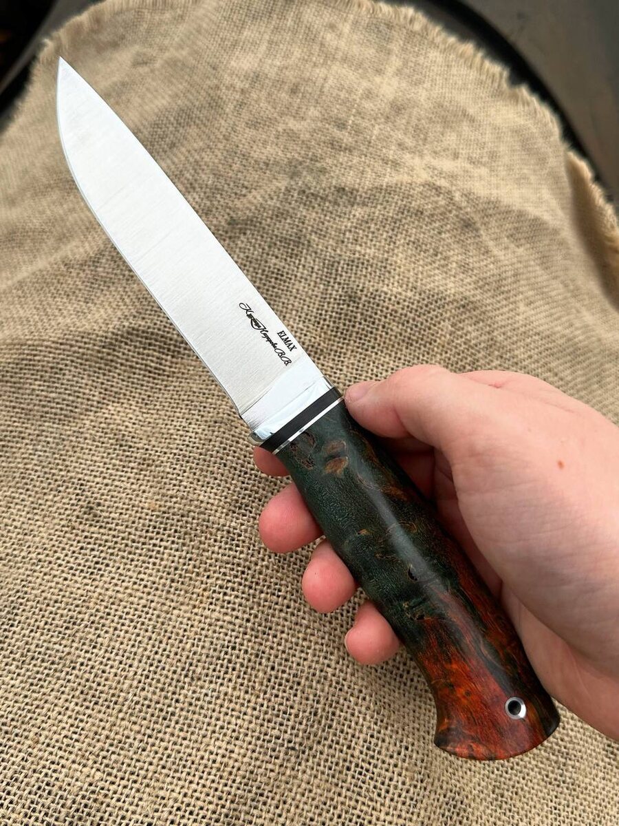 - 🌲 Рукоять — стабилизированная двухцветная карельская берёза: красиво смотрится, не боится влаги и комфортно лежит в руке даже при длительном использовании.