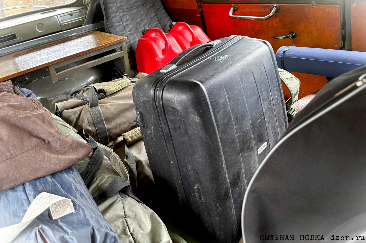 Совсем не собирался его снимать специально, а просто хотел запечатлеть внутренний мир «Буханки», на которой мой хороший приятель Виктор подкинул нас до места старта (накануне всю неделю поливали дожди, и у нас возникли сомнения, что мой любимый продукт немецкого автопрома справится с задачей). Не раз выслушивал удивлённые вопросы от рыбаков и водных туристов на предмет того, что же делает этот предмет в составе моего походного снаряжения. Уверен, что у многих читающих эту статью возникла та же мысль. Отвечаю). Чемодан «Samsonite» выполняет роль большого походного рюкзака и в условиях недельной стационарной стоянки гораздо лучше последнего. У рюкзака есть только одно преимущество перед чемоданом, которое заключается в том, что его можно таскать за плечами, а поскольку такую задачу наше предприятие не предусматривает, то в конкретных условиях его тоже нет. Чем же чемодан предпочтительнее рюкзака? Во-первых, он легче, во-вторых, чемодан даёт возможность гораздо логичнее и удобнее размещать вещи, а также за счёт полного раскрытия предоставляет беспроблемный доступ к содержимому (не нужно, как в рюкзаке, извлекать всё наружу, а потом запихивать обратно, чтобы добраться до какой-нибудь вещички, волей случая оказавшейся на самом дне, кто знает — тот понимает), в-третьих, для того чтобы внутрь чемодана попала вода, его нужно утопить, а вещи, находящиеся внутри, даже в самую пасмурную погоду не впитывают влагу. Да, существуют различные специальные гермосумки и герморюкзаки, но преимущество их перед обычными заканчивается именно на их водонепроницаемости, в остальном они, как правило, проигрывают своим обычным собратьям и, кроме того, дорого стоят, если речь идёт о качественных и надёжных изделиях проверенных туристических брендов.