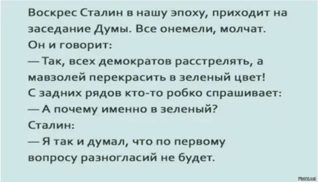 Знаете, есть такое старый анекдот про Сталина. См скрин. Так вот то, что в последнее время происходит вокруг программы Семейная ипотека очень мне это напоминает. Я так понимаю в стране вообще все проблемы уже решили? Да? Зарплаты, пенсии, дороги и тп все зашибись. Обсуждать больше нечего, кроме че бы там изменить в программе Семейная ипотека. Каждый день кто-то там наверху 👆что-то предлагает. Вот Очередной поток мыслей без связи с жизнью от г-на Володина. При чём здесь ставки и зп? Доход влияет на цену квартир. Ладно, поздравляю всех россиян с тем, что из всех бед в России осталась одна- Семейная ипотека. А не как раньше. Ну вы помните те самые две беды, же?) #Светлов #кредитныйброкер #ипотекапомощь #семейнаяипотека