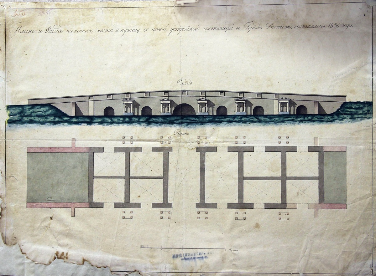 КАМЕННЫЙ МОСТ в Ростове В двух статьях историю создания в Ростове Каменного моста описала Любовь Печкина, об этом рассказано здесь. Там же сообщено, как мост закопали. В этом посте я публикую исполненный автором в цвете чертеж «фасада» этого моста. Изображение — в собрании ГМЗРК. От моста имеем только название улицы. И указание: сам по себе мост сохранился, он там, внутре!