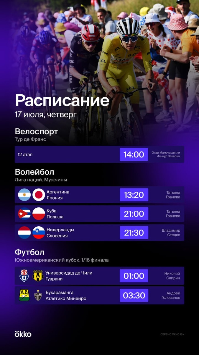 🙌 Разнообразие спорта сегодня в Okko. 12-й этап «Тур де Франс», 3 матча мужской волейбольной Лиги наций, 1/16 финала Судамериканы.