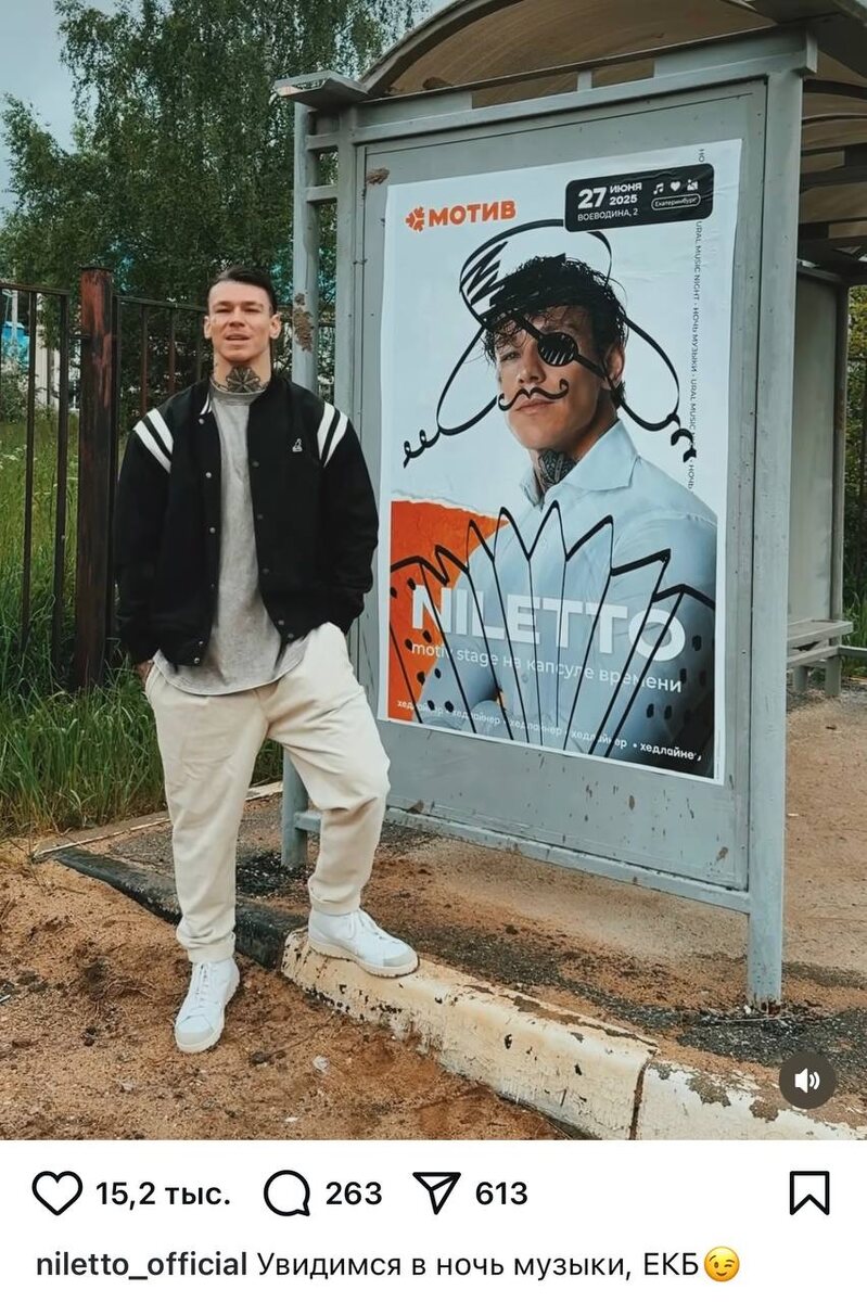 В конце июня на фестиваль «Ночь музыки» в Екатеринбурге приехал певец Niletto, чтобы дать концерт на площадке Мотив Stage. Прогуливаясь по городу, музыкант увидел свою разрисованную афишу и оценил ее в соцсетях: «Урал пошутил. Именно так меня видит кто-то из жителей Екатеринбурга. Ну что ж, хорошо».