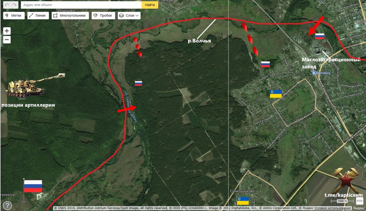 В ответ на пост Волчанск, южный берег То же самое что вчера, но на яндекс-гибриде и карте высот, которые мы контролируем. А разница очень приличная - более 100 метров перепад. Форсирование Волчьей и взятие приречных лесов - смыкает наши фланги: правый Старица-Бурговатка с левым Волчанским. И отодвигаем противника от наших переправ у Огурцово-Гатище (они немного севернее на схеме нет). Общий выход к Синельниково с двух направлений, станет значимым тактическим успехом. схемы и карты