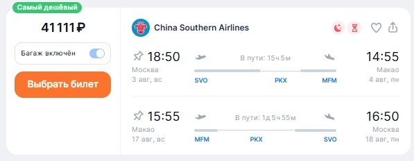 ✈️Москва - Макао (Китай), пересадка в Пекине, туда и обратно, с багажом за 41100 рублей 3 августа - 17 августа - https://checkintime.ru/6s4y 🏖 Поиск туров | ✈️Авиабилеты