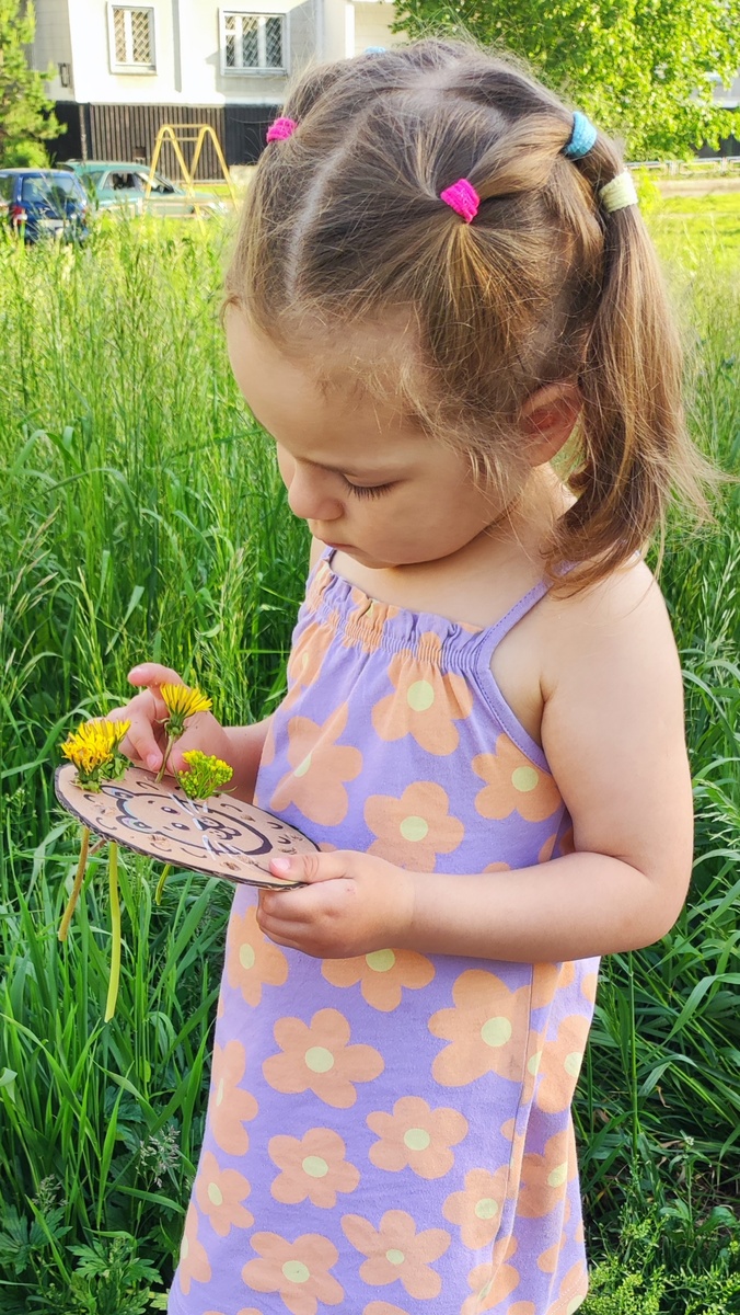 1. "Цветочное панно" - это игра отлично развивает воображение, креативность, внимательность и мелкую моторику, расширяет кругозор. Попутно можно изучать цвета и считать. Вам понадобится небольшая подготовка, но не волнуйтесь, это не займет много сил и времени. А из материалов понадобится лишь картон, маркер и ножницы. На кусочке картона нарисуйте мордочку льва, а в гриве сделайте отверстия. Цель игры украсить гриву льва различными цветочками и листочками. В результате будут получаться фантастические картины которые не оставят никого равнодушным. Для примера я взяла картинку со львом, но можно придумать много других вариантов: ваза с цветами, можно украсить крылья бабочки или сделать цветочную шубку для барашка. В зависимости от возраста вашего малыша количество и размеры отверстий на картонной заготовке можно менять. Так для малышей от 1-го до 2-х лет можно сделать на картоне всего 3-6 дырочек большого диаметра, чтобы в них было проще попасть стебельком цветка. А для ребят постарше можно увеличить количество дырочек на картоне и сделать их маленького диаметра. Ещё один плюс этой игры в том что сделанную заготовку можно использовать не один раз!