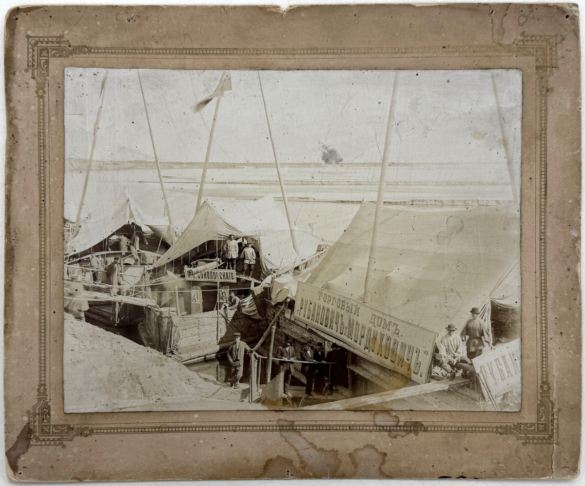 В коллекции Иркутского областного краеведческого музея имени Н.Н. Муравьева-Амурского имеются несколько изображений необычных малых судов – паузков-ярмарок. В широком смысле паузок – это плоскодонная лодка для путешествий по реке. Такие лодки использовались для перевозки грузов по реке Лене и для торговли с борта. Перед нами черно-белая фотография с изображением трех паузков-ярмарок, пришвартованных у берега реки. Конструкция лодок не совсем привычна: они довольно широкие, но плоские, с невысоким бортом, при этом с высокими мачтами и острым плоским носом. На палубах и трапах стоят люди. Видны также невысокие каюты, закрытые парусиновыми крышами, на дверях кают – рекламные плакаты. На двух судах видны вывески с названием торговых фирм: «С. Н. Соколовскаго» и «Торговый домъ «Рубановичъ и Мордуховичъ». Также хорошо видны товары, которыми торгуют на этих своеобразных плавучих прилавках: это и рулоны с тканями, и конская упряжь, и тюки с чем-то похожим на шерсть. Фотография на картонном пас