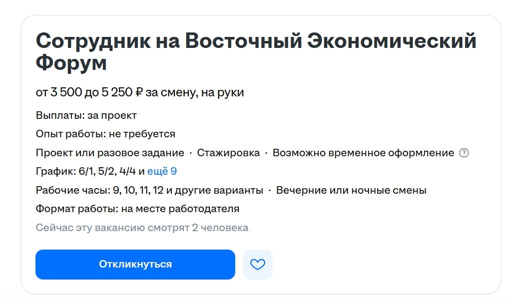 Ну что, вакансии на ВЭФ открыты. Некоторые еще с апреля. В основном требуются технические работники, грузчики, повара, бармены, официанты, водители, уборщики и модели. Зарплата зависит от должности и времени работы, например, водители приступают в середине августа, а промоутеры в первый день ВЭФ. Первым предлагают от 3-6 тысяч рублей за 12 часов, вторым 150-300 рублей в час. В среднем обслуживающий персонал может рассчитывать на 3-7 тысяч рублей за смену, это 12-15 часов, как и техники. Дороже всего обходятся грузчики. Но и график у них не простой. Хотели бы поработать на главном событии сентября? 🟥 Подписаться | Предложить новость