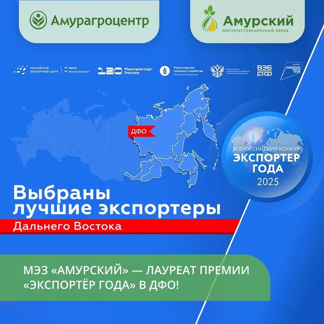 «Маслоэкстракционный завод «Амурский» вошел в число лучших экспортеров страны. Российский экспортный центр (РЭЦ, Группа ВЭБ.РФ) подвел итоги Всероссийской премии «Экспортер года». Конкурс проводится в рамках национального проекта «Международная кооперация и экспорт» и реализуется при активной поддержке Министерства промышленности и торговли, Министерства экономического развития и Министерства сельского хозяйства Российской Федерации. Процесс определения лучших экспортеров традиционно прошел в два этапа. На первом выявлены победители в каждом федеральном округе. Затем из числа лидеров окружных этапов будут отобраны компании, которые будут названы лучшими экспортерами страны. В Дальневосточном федеральном округе 40 наград у 31 компании. 4 лауреата работают на территории Амурской области. В номинации «Экспортер года в сфере базовой продукции агропромышленного комплекса» в категории «Крупный бизнес» «Маслоэкстракционный завод «Амурский», экспортирующий соевое масло, зашел в ТОП-3. Торжеств
