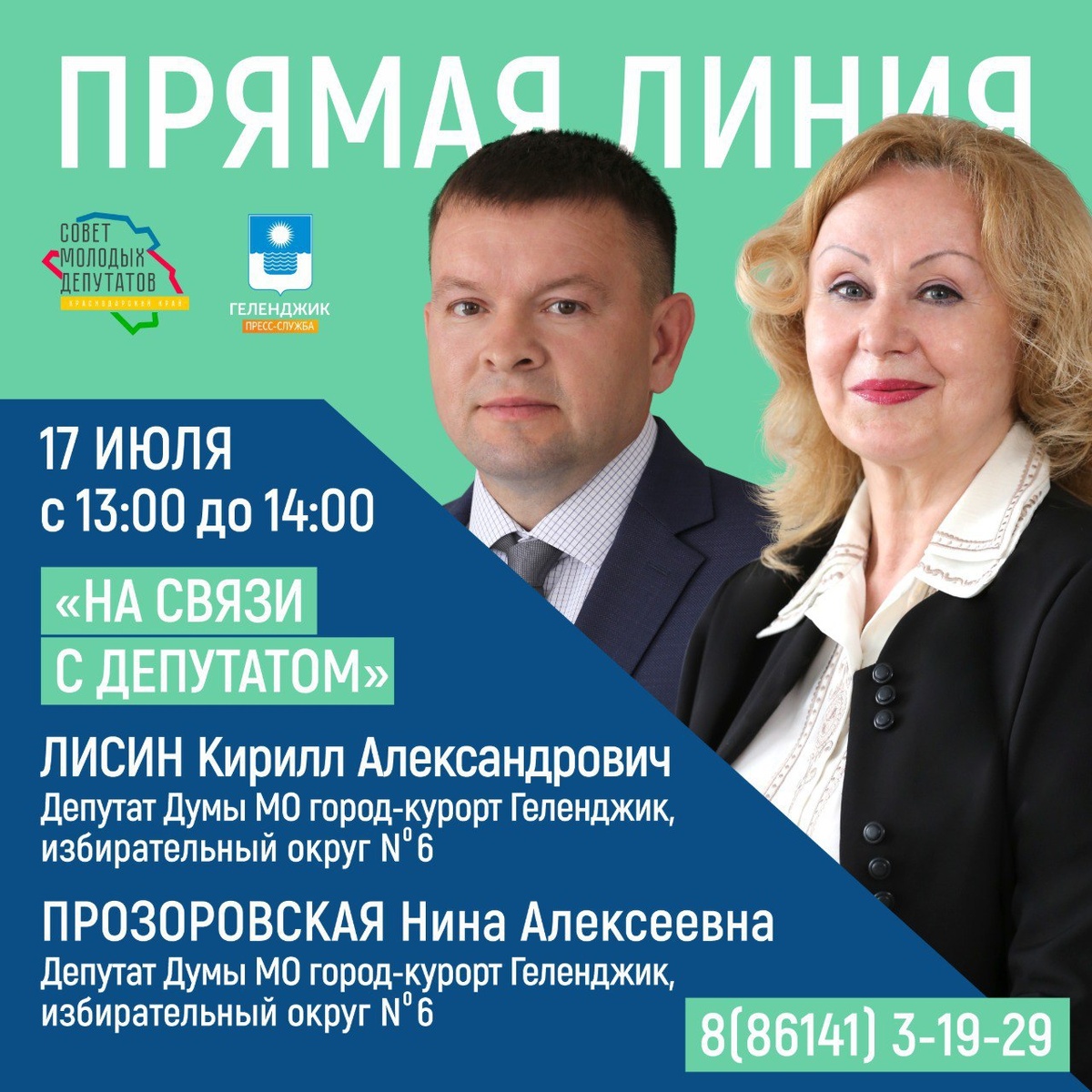 Сегодня, 17 июля, с 13:00 до 14:00 в Муниципальном центре управления на вопросы и предложения жителей курорта в рамках телефонного диалога будут отвечать депутаты Думы Геленджика Кирилл Александрович Лисин и Нина Алексеевна Прозоровская. Телефон «Прямой линии»: +7(86141)3-19-29.