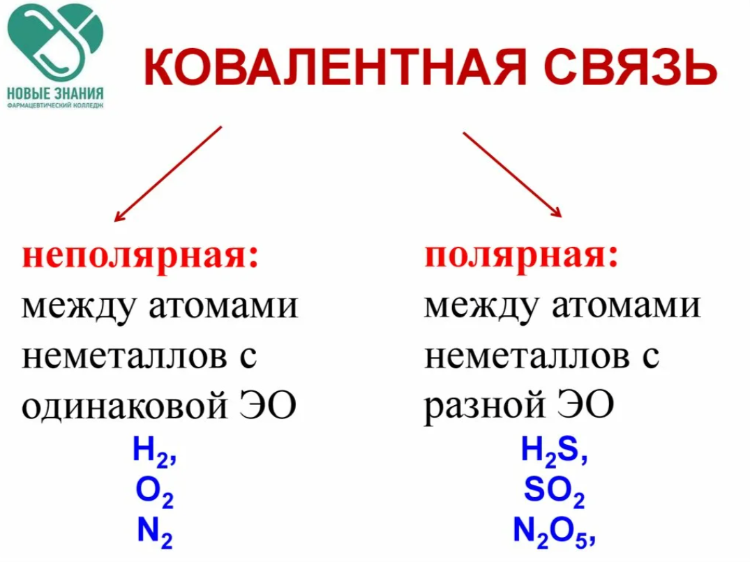 Ковалентная связь — это химическая связь, возникающая между атомами за счет обобществления электронных пар. Этот тип связи характерен для соединений неметаллов и объясняет образование молекул от простейших (H₂, O₂) до сложных органических веществ. Пример с HCl: Атом водорода (1ē) + атом хлора (7ē) → общая пара → H:Cl (H-Cl) ХарактеристикаОписаниеПрочностьЗависит от количества связей (одинарная < двойная < тройная)НаправленностьОпределяет пространственную структуру молекулНасыщаемостьОграниченное число связей у атома (валентность) Форма молекул определяется: Примеры: Практическое задание: Определите тип связи в молекулах: Ответы: