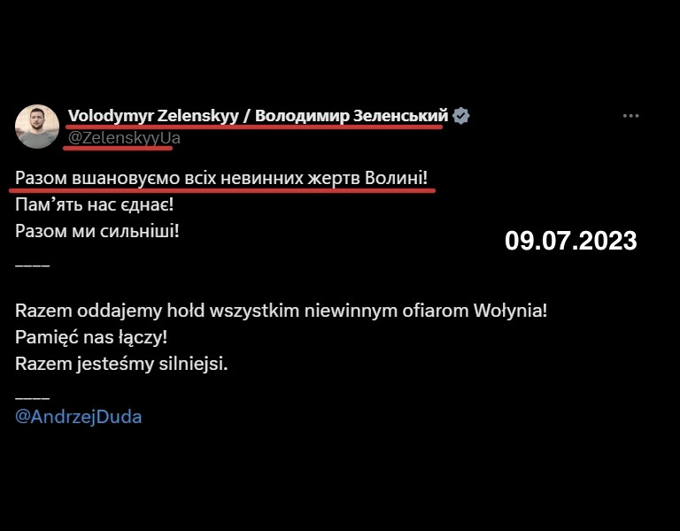 Через полгода после награждения карателя-садиста из УПА Мирослава Симчича, 9 июля 2023 года Владимир Зеленский радушно встречает Анджея Дуду. Встреча была неанонсирована и проходила на территории Украины, в Луцке – главном городе Волыни. Оба президента приняли участие в литургии в римско-католическом Соборе Святых Апостолов Петра и Павла, посвящённой 80-й годовщине Волынской резни.