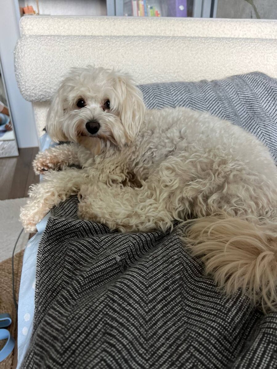 Второе занятие. Ева лежит на кровати и свысока смотрит, как хозяйка мучается на коврике 😁