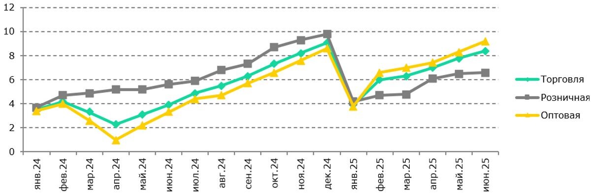 Розничная торговля демонстрирует небольшое повышение темпов роста до 6,6% г/г (5,6% г/г в январе-июне 2024 года). В структуре розничной торговли основную долю занимают непродовольственные товары - 69,9%, тогда как продовольственные товары составляют 30,1%. Такая пропорция частично отражает аналогичную структуру в оптовом сегменте. Каналы реализации розничной торговли сохраняют исторически сложившееся распределение: по итогам первого полугодия 2025 года доля индивидуальных предпринимателей составила 27,6%, незначительно увеличившись по сравнению с аналогичным периодом прошлого года (26,4%).