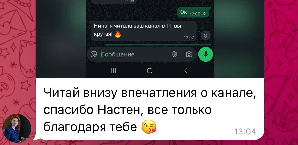 «Ты крутая!» - одна фраза, но как много она меняет... Когда скрины говорят громче любых слов 🥰 Вчера мне прилетела вот такая благодарность от клиентки на индивидуальном сопровождении — и я, если честно, сижу и улыбаюсь)) Момент, когда твой клиент получает обратную связь не только от тебя, а от реальных людей и уже своих клиентов, которые читают, замечают и говорят: «Ты крутая» — бесценен! И вот ты читаешь это — и думаешь: А что если один грамотно оформленный канал может изменить не только мнение других, но и в целом уверенность в себе? Telegram — это уже не просто соцсеть: ➡️ Это витрина твоей экспертности ➡️ Это инструмент, который работает даже тогда, когда ты спишь ➡️ Это то, что можно «показать», «переслать», «отправить», не краснея. Вот вам пример. Сегодня у меня был диалог с коллегой (маркетологом по офлайн продвижению), и мы выяснили, что у него нет: ❎ оформленного личного аккаунта ❎ грамотно выстроенного канала ❎ позиционирования в целом. А ведь мы вместе были на онлайн-
