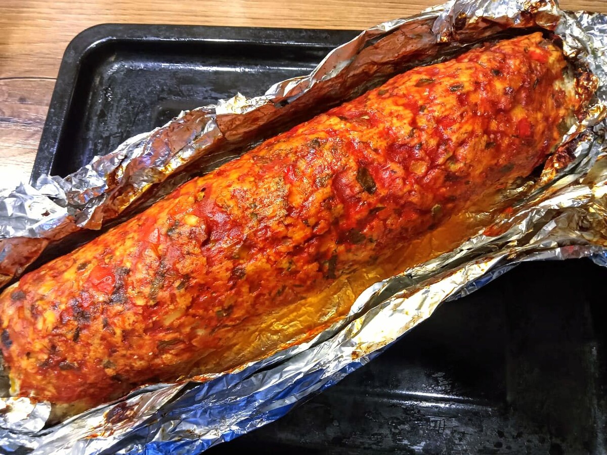Через час я достал рулет, порвал сверху фольгу, обмазал его кетчупом и сунул назад в печку на 15 минут подрумянится.