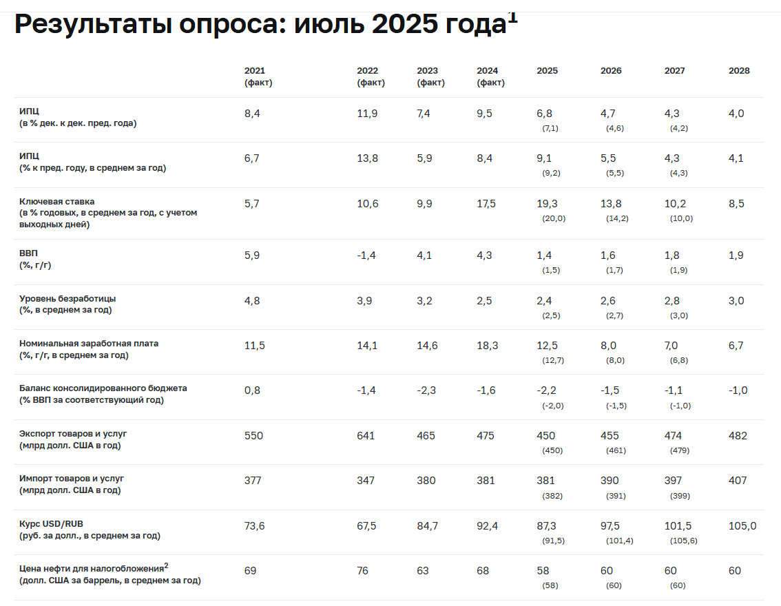 Перед заседанием по ключевой ставке Банк России традиционно проводит опрос ведущих аналитиков страны и публикует на его основе прогноз основных макроэкономических показателей. Так и на этот раз. Далее разберу, что изменилось в ожиданиях аналитиков со времен предыдущего опроса, проведенного в конце мая. Потому что наиболее важной считаю не сами цифры, а динамику таких изменений. Вот сводная таблица с данными (в скобках указаны предыдущие значения). Начнем с данных по инфляции. Ожидания на конец текущего года заметно снизились на 0,3 п.п., составив 6,8% после 7,1% по майским данным. При этом ожидаемый среднегодовой показатель инфляции изменился гораздо слабее - только на 0,1 п.п., составив 9,1% (это значение недалеко от текущих показателей). Грубо говоря, аналитики сейчас считают, что инфляция будет держаться более высокой в ближайшие месяцы, но в конце года резко упадет. Довольно странно, но как есть. Этот данные консенсуса. Разброс ожиданий при этом куда шире. Также примечательно, что