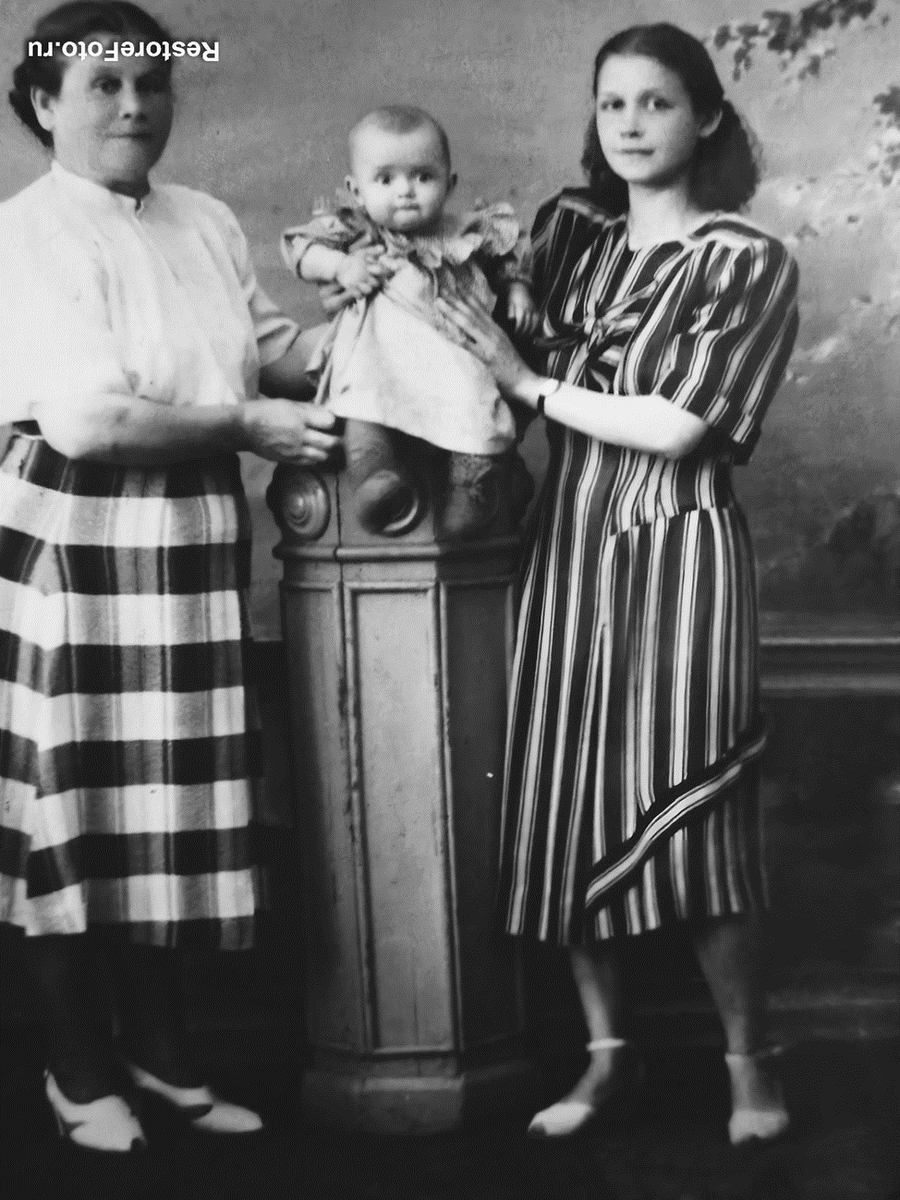 Это, наверное, моя первая фотография. Мне нет ещё и года. Бабушке 50 лет, маме 25 лет. Сделано фото в Архангельске в фотоателье. Мама обещала послать фотографии бабушке Ларисе, маме отца, в Ленинград. На этом фото я с моей первой няней Тамарой. Девушка приехала из деревни учиться в вечерней школе, а днём сидела со мной. Декретные отпуска раньше были всего 2 месяца. Это 1954 год. Тамара жила у нас. Мама эту няню очень хвалила. На этом фото я с двоюродной сестрой Наташей Розенцвейн. Нас так и звали : Наташа большая и Наташа маленькая. Сестра старше меня на пять лет. Предполагаю, что ей лет 7, а мне 2 года. Это 1955 год. Нас с Петей не очень часто фотографировали. У дедушки Лёши фотоаппарат появился позднее. А, когда мы были маленькими, фотографировались в фотоателье, или фотограф приходил домой. Фотографии делали качественные. Моя мама в молодости часто фотографировалась в фотоателье. Эти фотографии сделаны дома хорошим фотографом. Тогда детям говорили: «Смотри сюда, сейчас вылетит птич