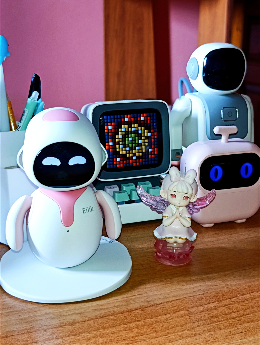 Так вышло, что коллекционирую я не только кукол. Интерес к роботам у меня был с детства, всегда с восхищением смотрела рекламу, в которой дети играли с роботами-домашними питомцами. Разумеется, у меня такого технологичного животного не было, как и у моих друзей. Зато со временем появилась оригинальная Барби, чему я была бесконечно рада. Теперь же у меня столько кукол, что в детстве и не снилось, а на моем рабочем столе поселились роботы. По правде говоря, настоящим роботом на фотографии выше является только Eilik. Эйлик —интерактивный робот-компаньон с искусственным интеллектом. Он оснащён сенсорными датчиками, может взаимодействовать разными способами, включая танцы под музыку и различные игры. Eilik реагирует на прикосновения, обладает характером, а его настроение будет зависеть от того, как с ним обращается владелец. Безусловно, его основное предназначение – поднимать настроение, однако мне понравилась функция, благодаря которой робот будет следить за вашим балансом работы и отды