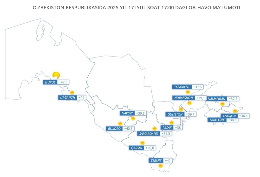 Qoraqalpog‘istonning Nukus shahrida havo harorati +43 darajagacha ko‘tarildi Bunday harorat 17-iyul soat 17:00 holatiga kuzatilgan. @daryolive