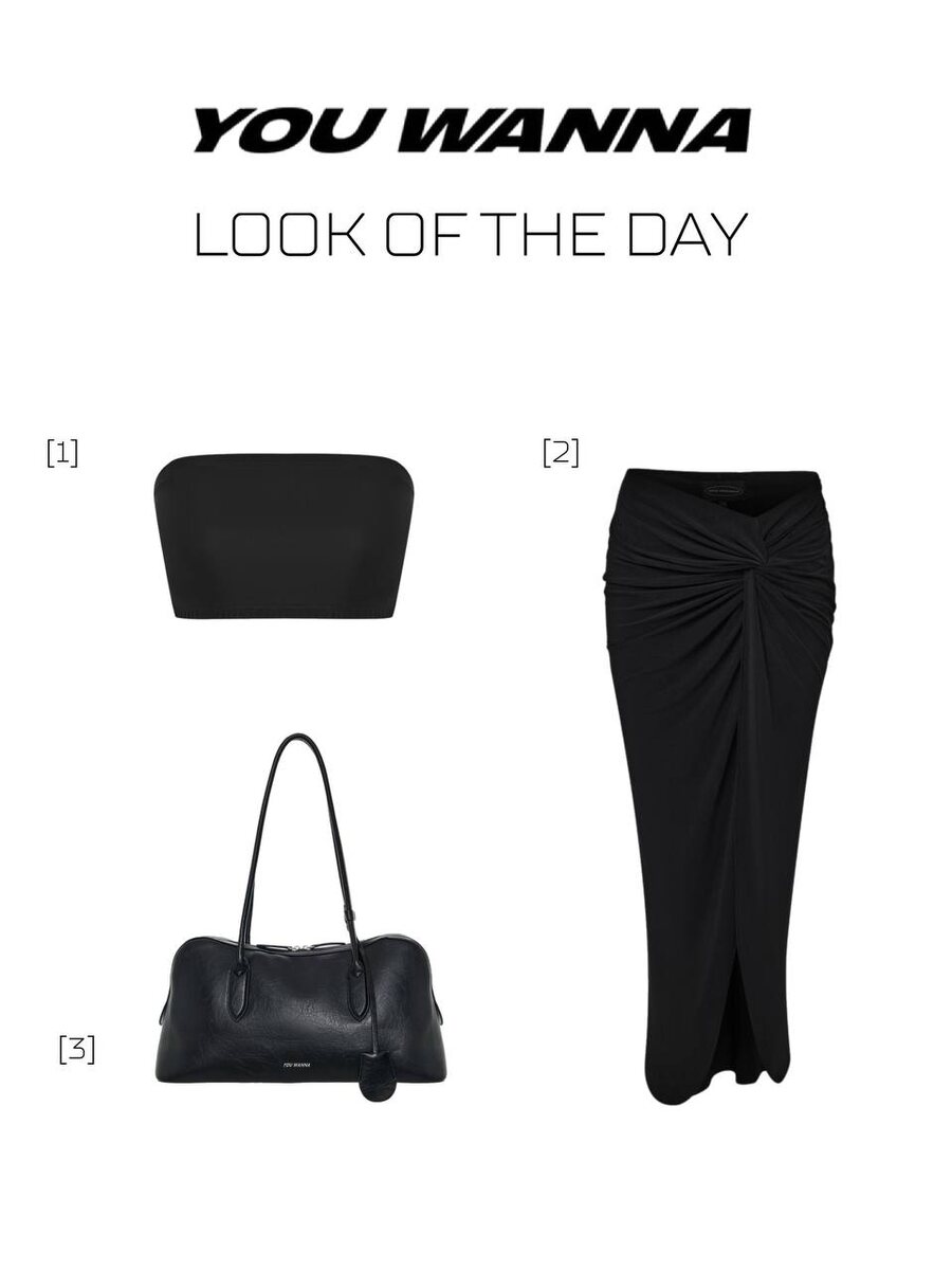 LOOK OF THE DAY [1] Топ бандо в черном цвете [2] Юбка макси с драпированным узлом [3] Сумка из натуральной кожи скачать мобильное приложение App Store и Google Play