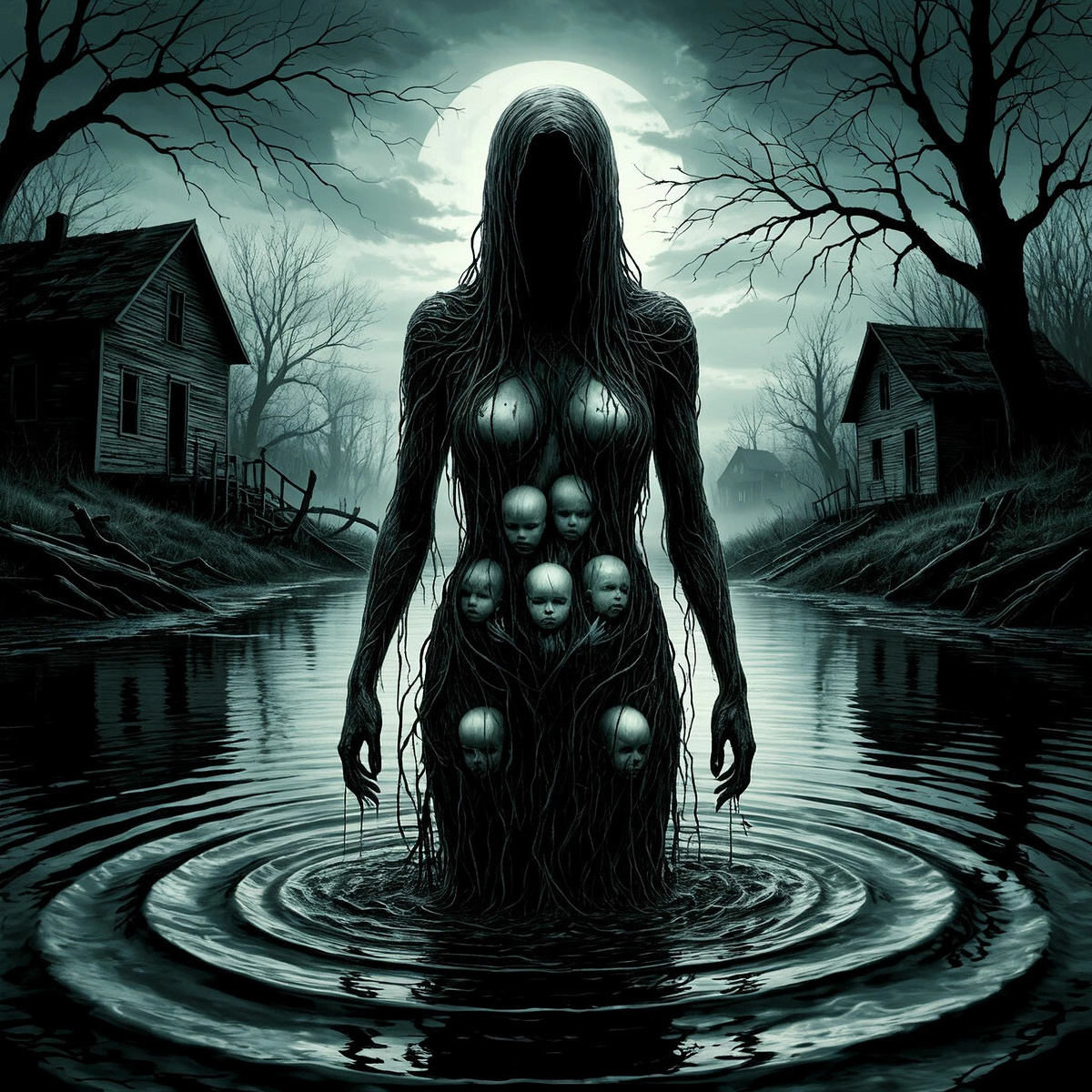 Вода прямо передо мной начала медленно вздыматься, бурлить, словно на дне проснулся гейзер. Но вместо пара на поверхность поднималась черная, маслянистая грязь. Она собиралась, уплотнялась, росла вверх, обретая форму. Это была колоссальная, бесформенная фигура, выше человеческого роста, смутно напоминающая женщину. Огромную, беременную женщину, слепленную из ила, коряг и вековой речной тоски. У нее не было черт лица. Только гладкая, овальная поверхность, с которой стекали струйки грязной воды, словно слезы. Внутри ее полупрозрачного, колеблющегося тела, как в янтаре, застыли смутные, бледные образы — крошечные ручки, ножки, неясные очертания детских лиц. Души, которые она забрала.