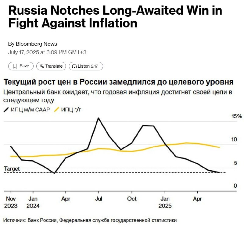 🪖 Россия одерживает долгожданную победу в борьбе с инфляцией — Bloomberg