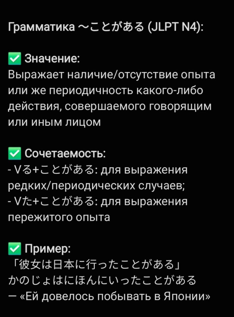 Грамматика ~ことがある (JLPT N4): ✅ Значение: Выражает наличие/отсутствие опыта или же периодичность какого-либо действия, совершаемого говорящим или иным лицом. Переводится как «иногда»/«бывает, что»/«есть случаи, когда...»/мне доводилось и т.д ✅ Сочетаемость: - Глагол в основном времени + ことがある: для выражения редких/периодических случаев; - Глагол в прошедшем времени + ことがある: для выражения пережитого опыта ✅ Примеры: 「時々、映画を見に行くことがある」 ときどき、えいがをみにいくことがある — «Иногда я хожу смотреть фильмы» 「彼女は日本に行ったことがある」 かのじょはにほんにいったことがある — «Ей довелось побывать в Японии» #грамматика #JLPT_N4
