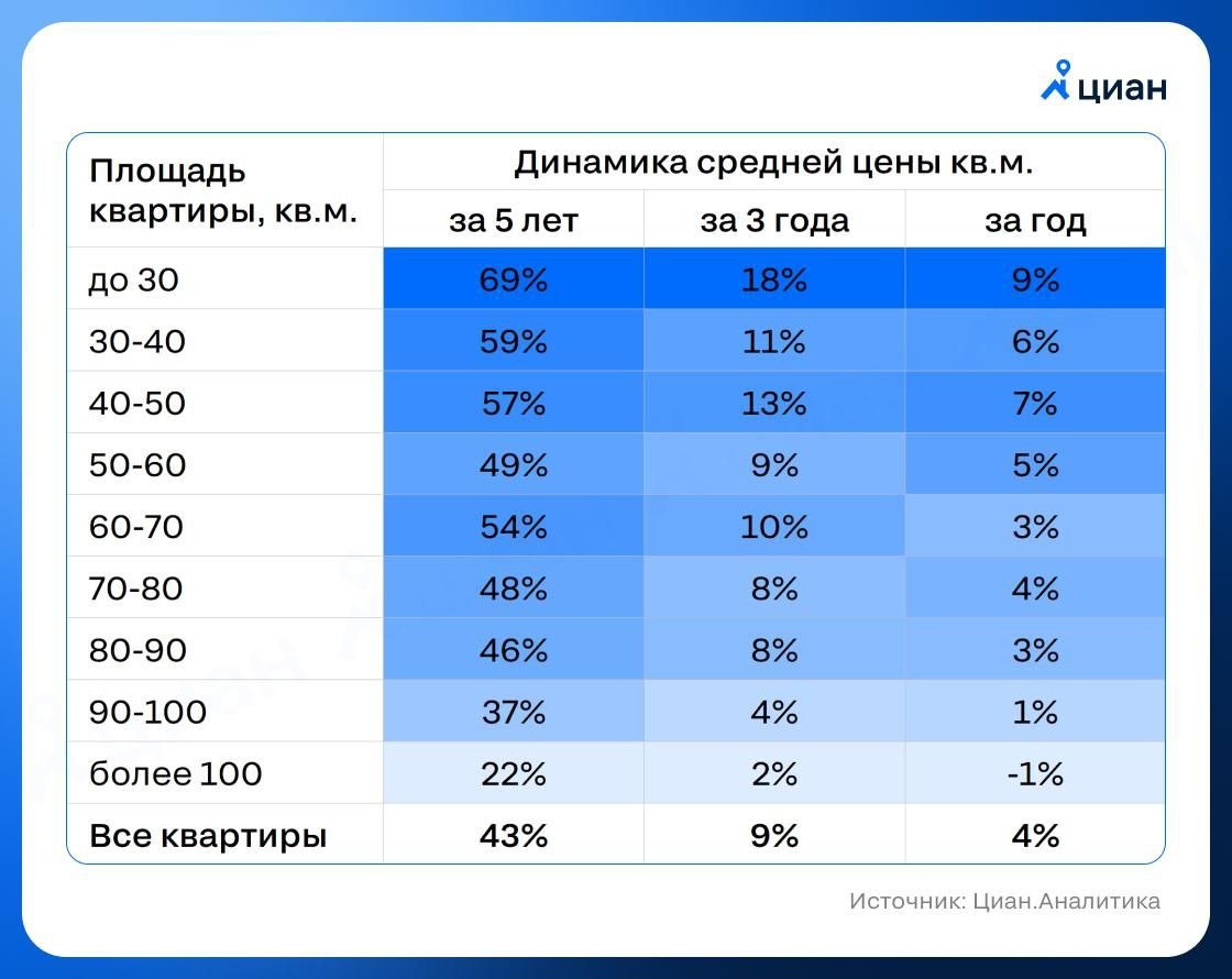 Чем больше площадь квартиры, тем медленнее она растет в цене, — ЦИАН. Так, за последние пять лет стоимость московского квадратного метра выросла в среднем на 43%, но самые маленькие квартиры площадью до 30 м² при этом подорожали на 69%. @nedvizhna
