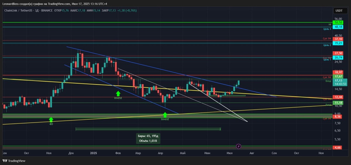 В ответ на пост #LINK ❓❓❓ Поскольку вижу и слышу, что я не один инвестор) в данный актив, прокомментирую текущую ситуацию! ⚠️Маринует он нас здорово, но другого я от него и не ожидал, говорил об этом ранее, актив довольно тяжелый и не относится к памп токенам. На недавнем июньском проливе докупил его в зоне уровня 12$, на часть профита с той самый сделки по ETH, о фиксе которой вам сообщал также!! ⚠️Сейчас моя инвест поза по активу благодаря доливу на откатах уже находится в профите. 3D график пробил полугодовую нисходящую трендовую сопротивления и как видим закрепляется = мощный позитив! Будет ли ретест трендовой, увидим, может и не быть. Есть ключевая среднесрочная зона сопротивления уровня 16$, которую в настоящий момент цена продавливает. Чуть ранее в данной зоне уже был ложный пробой, вероятно, что настоящее движение продолжится вверх, на позитивной волне ETH!! P.s. мне недавно задавали вопрос, зачем я держу в инвесте такой тяжелый актив?? Друзья, для меня подобный актив, это