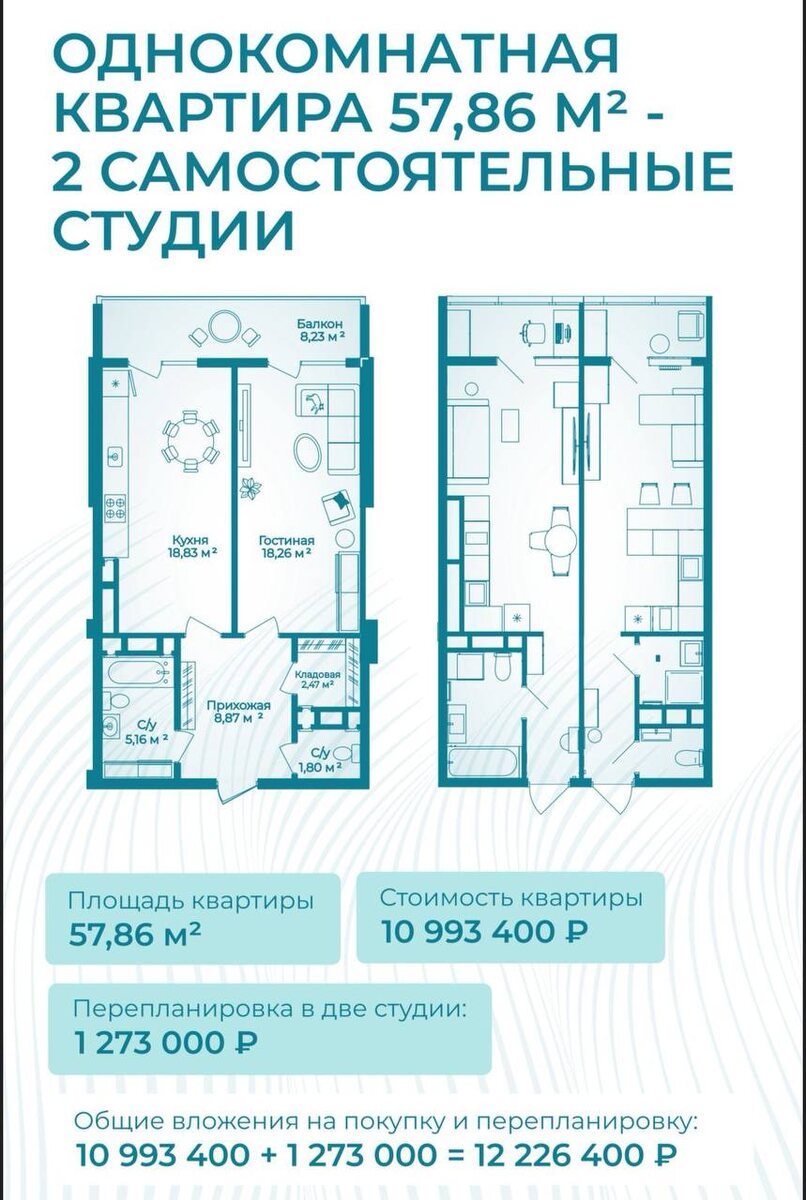 🏡 Инвестиционный проект: Покупка и перепланировка 1-комнатной квартиры в две студии на Черноморском побережье 🔥Выгодное вложение с доходностью от аренды! 📍 Преимущества локации Премиальный район с развитой инфраструктурой: ✔ 5 минут до лучших пляжей ✔ 1 минута до торговых центров ✔ 20 минут до культурных достопримечательностей 📊 Финансовые показатели - Стоимость квартиры: 10 993 400 ₽ - Перепланировка в две студии: 1 273 000 ₽ - Меблировка (2 студии): 466 000 ₽ - Общие вложения: 12 732 400 ₽ 💰 Доходность ✔ Летний сезон (120 дней): - Доход: 1 080 000 ₽ - Чистая прибыль: 923 200 ₽ ✔ Межсезонье (9 месяцев): - Доход: 630 000 ₽ - Чистая прибыль: 520 200 ₽ 💡 Годовой доход: ~1 443 400 ₽ 📅 Срок окупаемости: ~8,9 лет 🔒 Гарантии безопасности ✔ Финансирование через крупный банк ✔ Защита средств на эскроу-счетах ✔ Государственный контроль строительства 🛎 Полное сопровождение - Подбор арендаторов - Юридическое сопровождение - Контроль за состояни