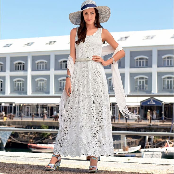 Длинный белый сарафан на широких бретелях с разнообразием ажурных узоров ♥