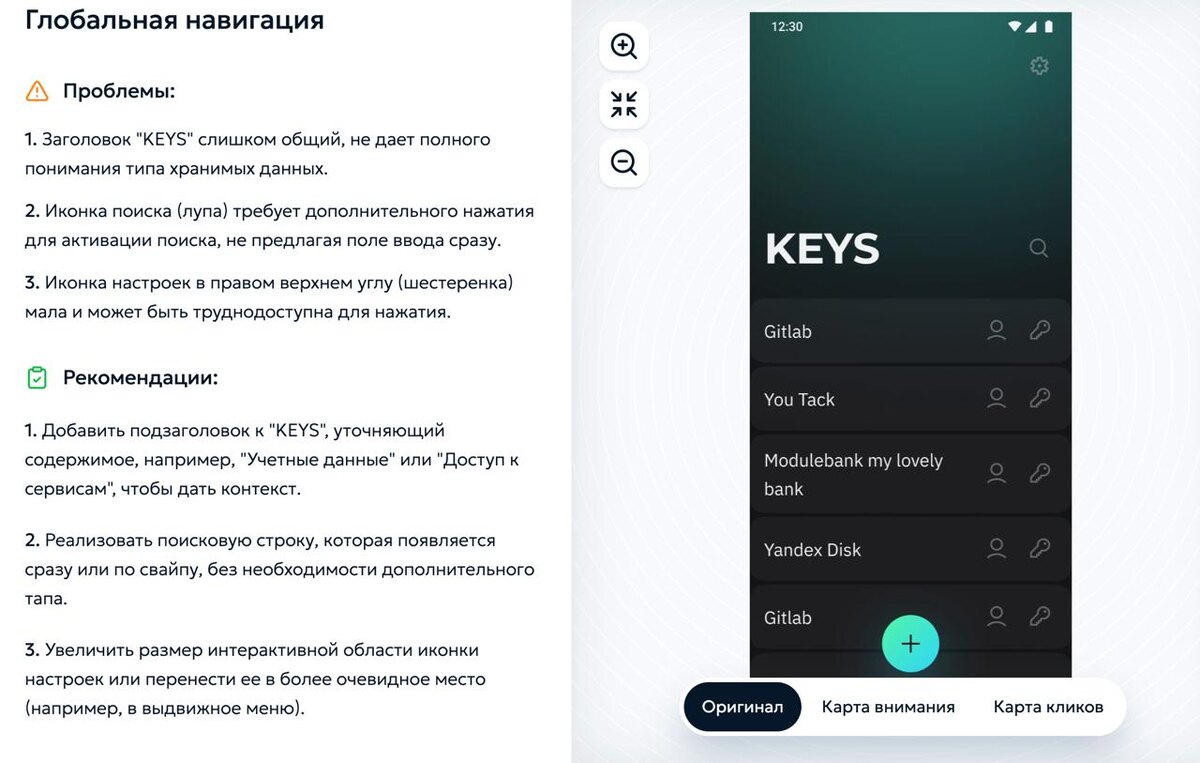 Нейросетевой фидбек Ещё один ИИИИИнструмент для дизайнера. Здесь нейросеть даёт фидбек. Для джунов/мидлов без лида — кайф, базовые ошибки замечает. Закинул ему свой интерфейс пет-проекта. Итог: 1. Есть здравый фидбек, например, что настройки слишком мелкие и незаметные 2. Воображает карту внимания и кликов, прикольно Часть, конечно, нерелевантна, но почитать интересно. Накидывает идей как сделать лучше. Карта кликов отработала странно — наверняка все будут тыкать на кнопку внизу. В общем, если у вас некому давать фидбек, то это лучше, чем собственные домыслы. https://www.usera.app/