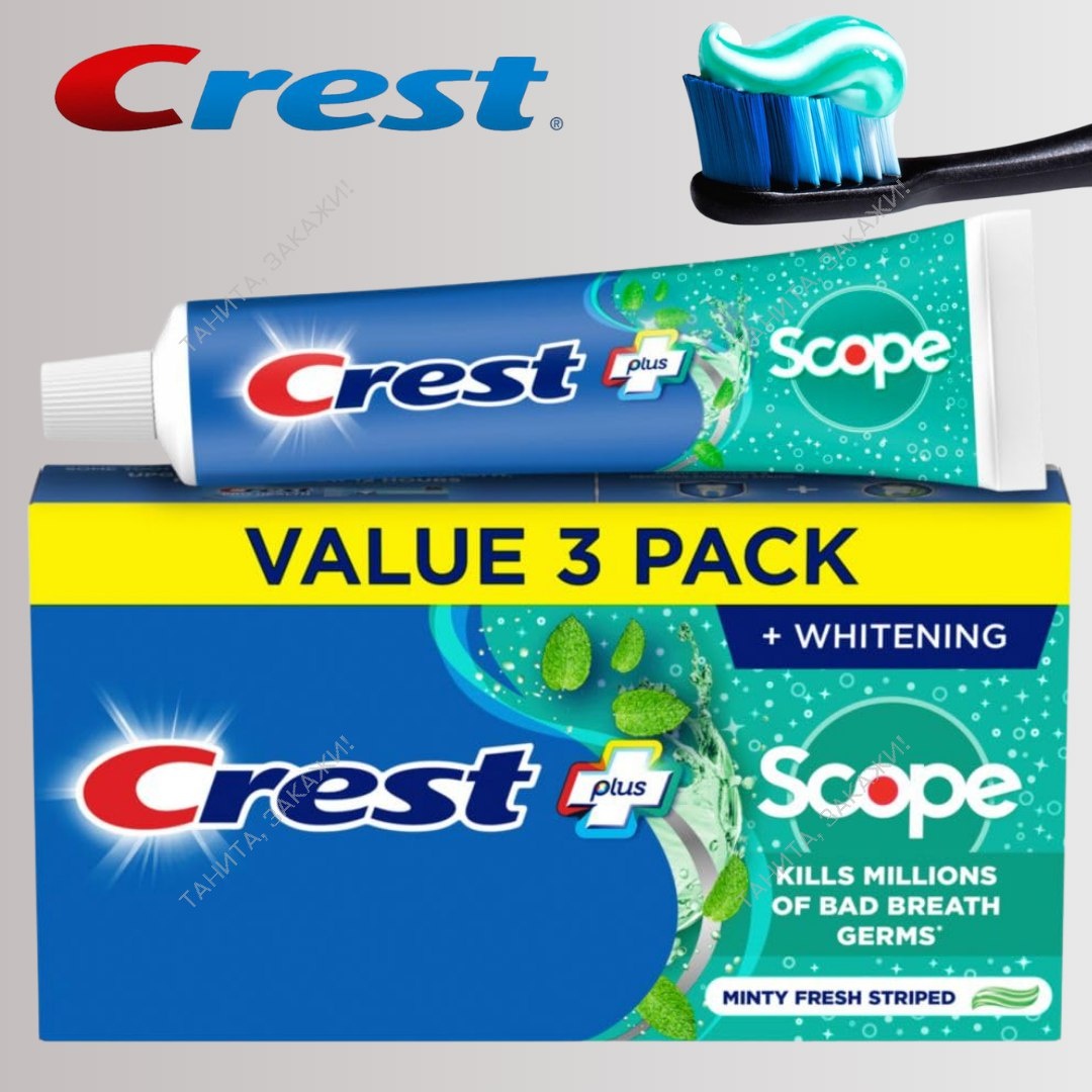 Crest Отбеливающая зубная паста Crest + Scope 3 шт 1200₽ ➡️ 1100₽ + доставка 3 x 159 мл Фторидная зубная паста с противокариесным эффектом, свежее дыхание, уничтожение микробов, защита от зубного камня, защита эмали – свежий мятный вкус 📩 @tanita_sadovnik 🚚 Доставка 4-6 недель 📦 ✅ 100% оригинал 🇺🇸