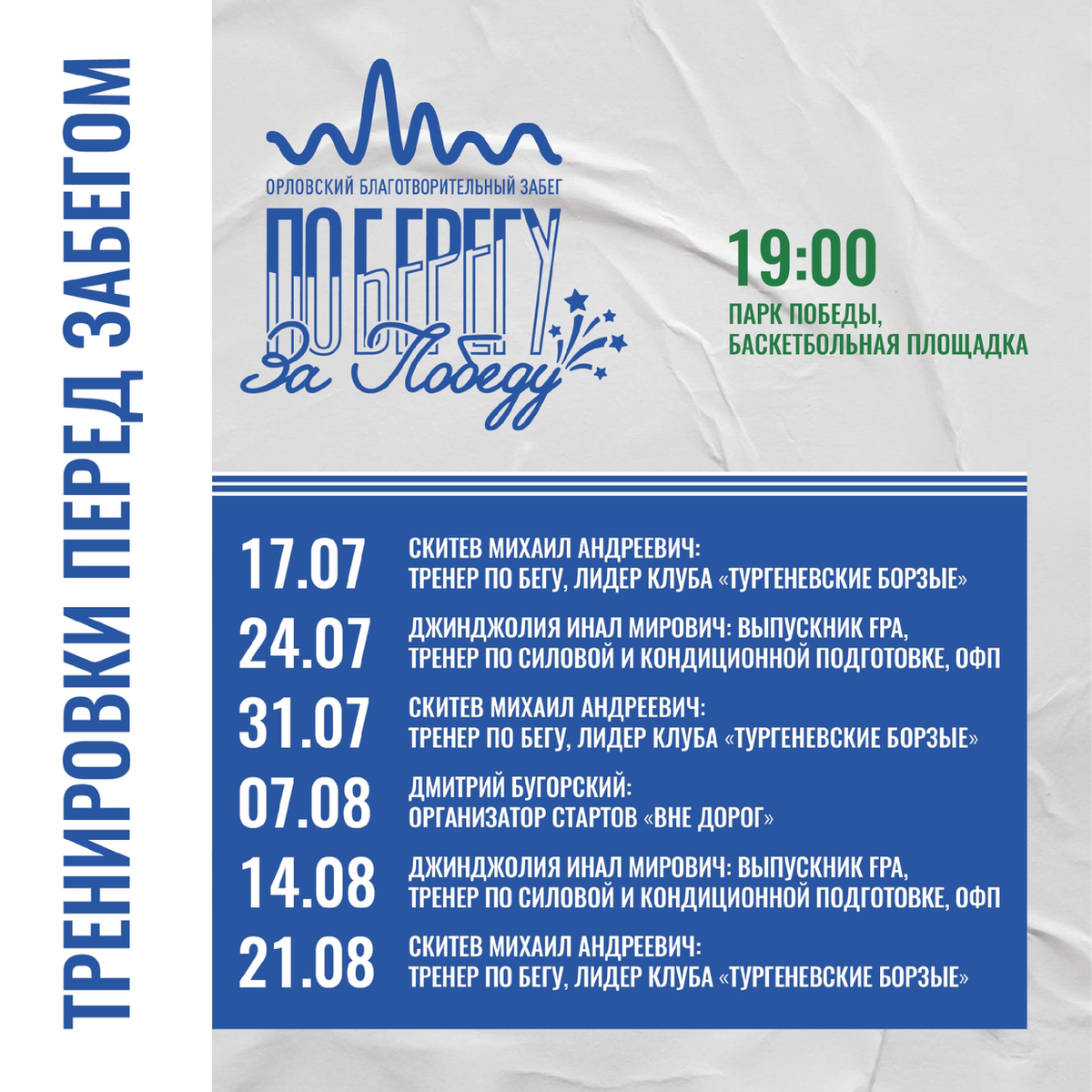 🔥 💪 Вы когда-нибудь замечали, как после хорошей тренировки появляется особенная уверенность в себе — ты знаешь, что справишься, что готов к испытанию? Именно такую уверенность и даёт регулярная подготовка. А потому — **да, мы стартуем вместе!** 🏃♂ Мы рады объявить о начале серии **подготовительных тренировок** перед масштабным и добрым событием — **Благотворительным забегом «Поберегу»**! Это не просто бег, это возможность сделать шаг ради помощи другим, но сначала — сделать шаг навстречу своей лучшей форме. Тренировки уже стартуют! **Первая тренировка состоится 17 июля в 19:00** Следите за обновлениями графика — будем работать на результат, но с умом! Всё будет проходить в самом сердце города — в **парке Победы**. Удобно, красиво и по-настоящему мотивирующее место для старта больших дел. Чтобы вы не просто пробежали дистанцию — а **прочувствовали каждую секунду**, получили удовольствие от процесса и гордость за себя. Мы будем работать над: - **Выносливостью** - **Правиль