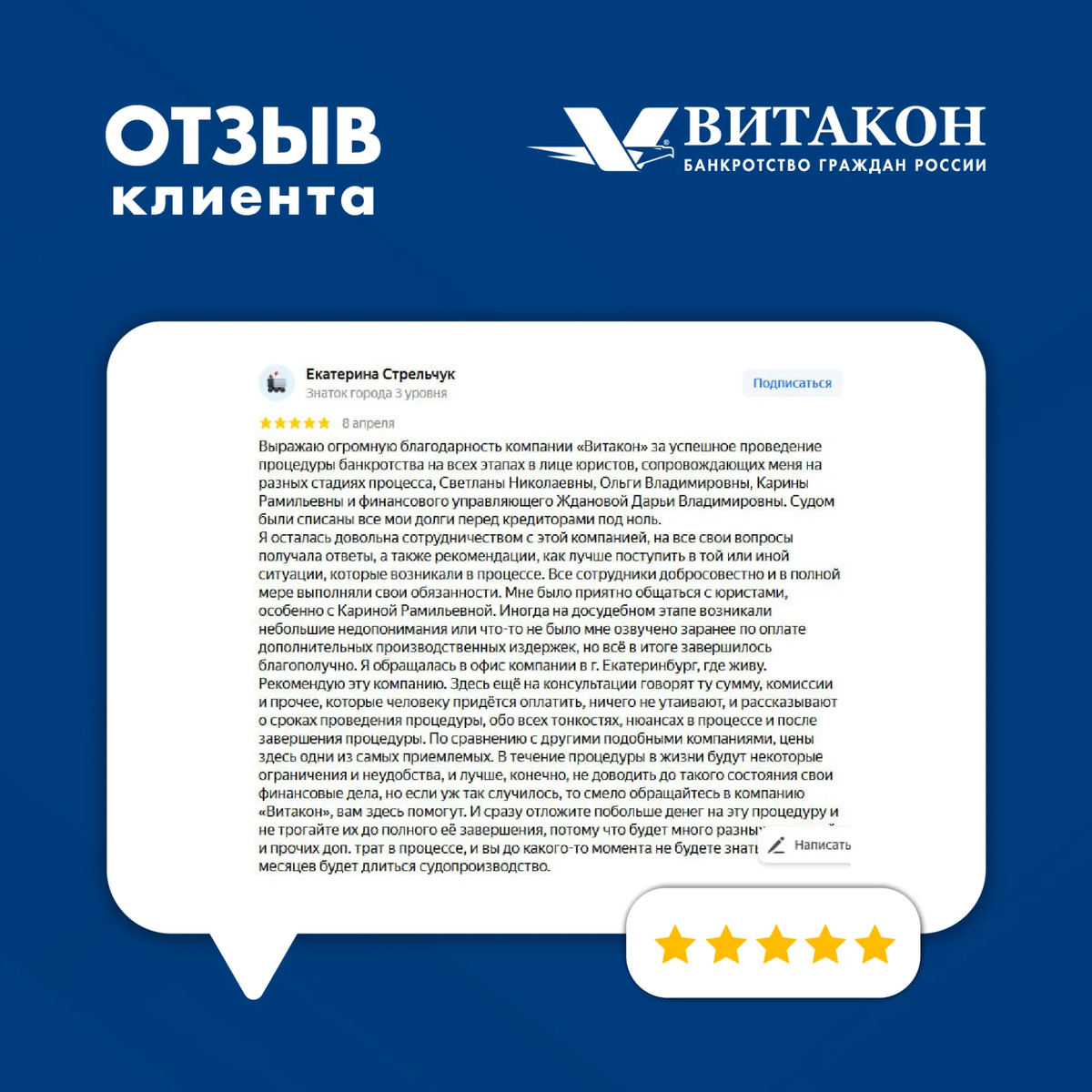 Что на самом деле стоит за словами «Спасибо, Витакон»? Истории, которые мы читаем в ваших отзывах. Когда вы видите в интернете очередной отзыв с пятью звездами, что вы думаете? А знаете, что видим мы, когда читаем ваши отзывы? Мы видим целую историю. За сухими строчками «Все прошло хорошо, долги списали» мы видим самый первый звонок, когда человек, волнуясь, рассказывал нам о своей проблеме. Мы помним его страх перед судом, его сомнения и бессонные ночи. Мы видим его путь — от полного отчаяния до того дня, когда он получил на руки определение суда и впервые за долгое время вздохнул свободно и перестал тревожиться за своё будущее. Для нас каждый ваш отзыв — это не просто оценка нашей работы. Это финал долгого и сложного пути, который мы прошли вместе с вами. Это доказательство того, что ещё одна семья обрела спокойствие, ещё один человек вернул себе контроль над своей жизнью. Именно поэтому мы хотим поделиться этими историями с вами. Ниже — лишь малая часть слов благодарности от людей,