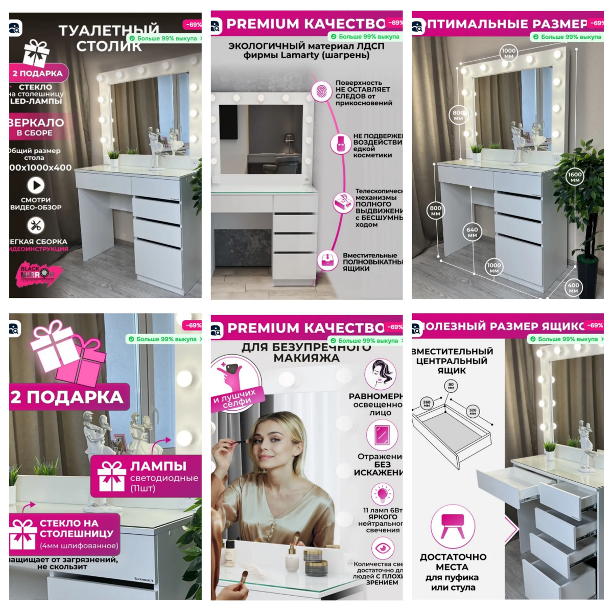 Добавьте дополнительные ракурсы: детали, текстуру, вид сбоку, сверху, в разложенном и собранном виде. Это помогает покупателю лучше понять, что он покупает, и уменьшает вероятность возврата. - Используйте инфографику и схемы