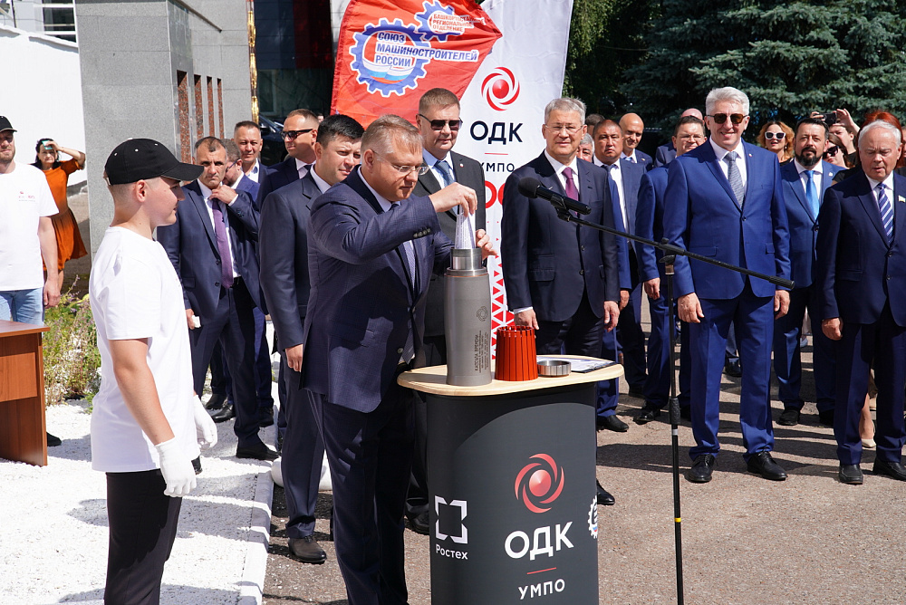 17 июля в Уфе Глава Башкортостана Радий Хабиров принял участие в торжественной церемонии закладки «Капсулы времени» будущим моторостроителям. Событие состоялось в рамках праздничных мероприятий, посвящённых 100-летию со дня основания ПАО «ОДК-УМПО». «Капсулу времени», изготовленную из нержавеющей стали, заложили на вековом юбилее ОДК-УМПО. В неё вошли артефакты, отражающие традиции и ценности предприятия: послания будущим поколениям, книга об истории авиационного двигателестроения, юбилейный выпуск корпоративной газеты, рисунки детей заводчан и другие материалы. Глава Башкортостана Радий Хабиров поблагодарил тружеников и ветеранов за профессионализм и преданность делу, а также пожелал заводу продолжать развиваться. Бывшие руководители, включая Александра Артюхова и Юрия Пустовгарова, также поздравили объединение. Управляющий директор ОДК-УМПО Евгений Семивеличенко отметил важность капсулы как послания будущим моторостроителям и призвал верить в себя, любить Родину и завод. Капсулу и па