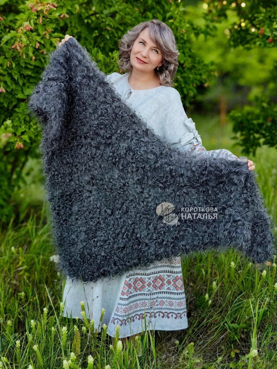 Эта пуховая треугольная шаль ( а благодаря размеру и количеству израсходованного пуха , эту косынку по праву можно назвать шалью ) не случайно носит название " Выбор Королевы " , ведь она по настоящему царская . Шаль связана из отборного , самого лучшего , роскошного пуха - руно , удивительного стального цвета ,с блестящим густым локоном , эта косынка из серии " Как для себя " и " Для тех кто понимает " Этот пух еще называют "Персюк , тем самым сравнивая его с мехом , изделия из такого пуха невероятно мягкие и тактильно приятное , будто касаешься волос новорожденного ребенка или крошечного котенка . Косынка плотной , густой вязки ( но при этом эластичная ) , имея такой полушалок и платка не нужно , т к эта вещица согреет не хуже , а в носке треугольная шаль даже удобнее...