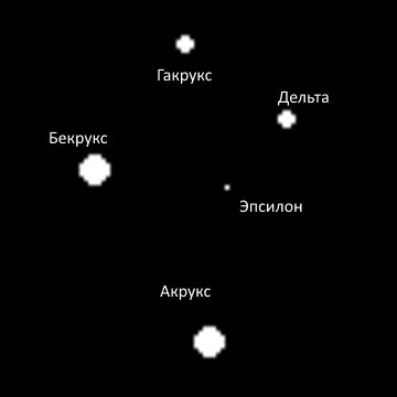 Первоначально звёзды Южного Креста входили в созвездие Кентавра. Окончательно выделил Южный Крест Августин Ройе в 1679 году. Акрукс - звезда 0,7 величины, расстояние 320 световых лет. День этой звезды - 14 день Весов. Бекрукс - звезда 1,3 величины, расстояние 280 световых лет. День этой звезды - 15 день Весов. Гакрукс - звезда 1,6 величины, расстояние 88 световых лет. День этой звезды - 16 день Весов. Дельта - звезда 2,7 величины, расстояние 360 световых лет. День этой звезды - 17 день Весов. Эпсилон - звезда 3,5 величины, расстояние 228 световых лет. День этой звезды - 18 день Весов. В созвездии находится рассеянное скопление Шкатулка, расстояние 6400 световых лет. День этого скопления - 23 день Весов. Также в созвездии находится тёмная туманность Угольный Мешок, закрывающая часть Млечного Пути. Расстояние 600 световых лет.
