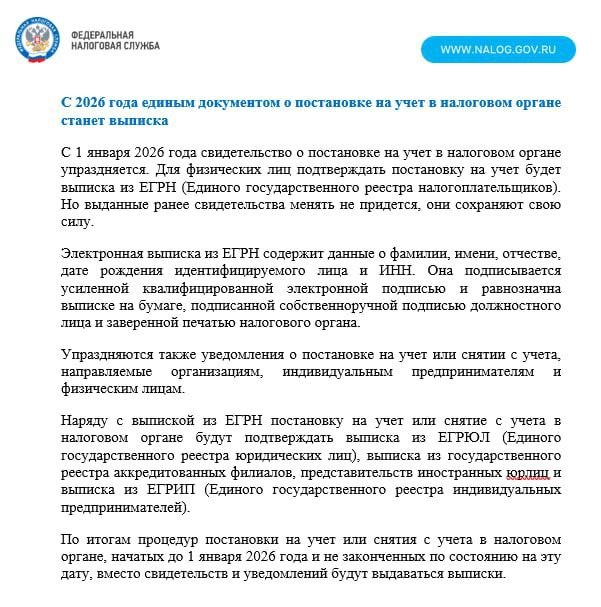 Межрайонная ИФНС России № 16 по Московской области информирует: 🔹с 2026 года единым документом о постановке на учет в налоговом органе станет выписка из ЕГРН.