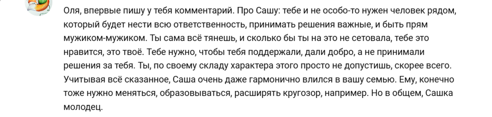 Оля, впервые пишу у тебя комментарий. Про Сашу: тебе и не особо-то нужен человек рядом, который будет нести всю ответственность, принимать решения важные и быть прям мужиком-мужиком. Ты сама всё тянешь, и сколько бы ты на это не сетовала, тебе это нравится, это твоё. Тебе нужно, чтобы тебя поддержали, дали добро, а не принимали решения за тебя. Ты по своему складу характера этого просто не допустишь, скорее всего. Учитывая всё сказанное, Саша очень даже гармонично влился в вашу семью. Ему, конечно, тоже нужно меняться, образовываться, расширять кругозор, например. Но в общем, Сашка молодец.