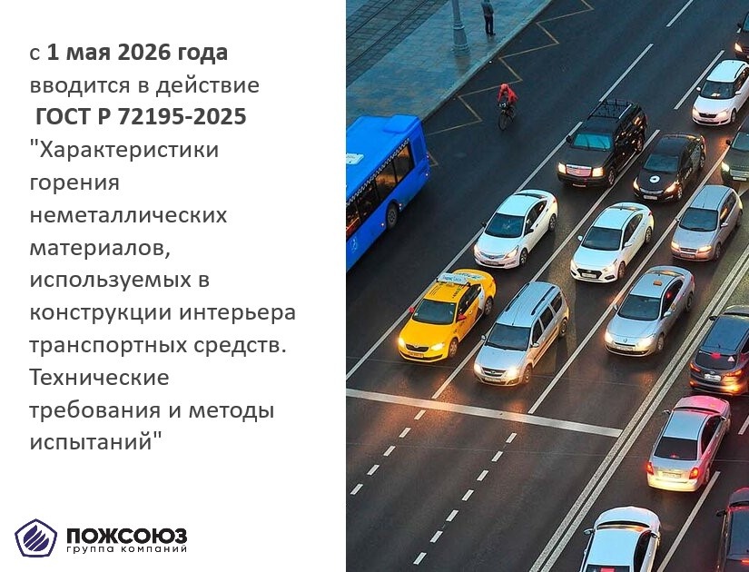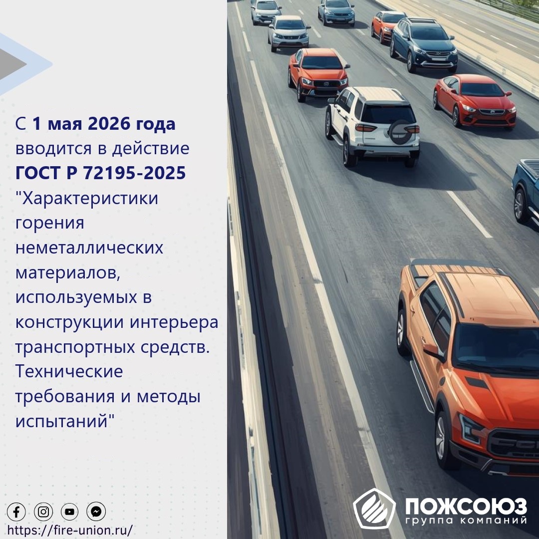 С 1 мая 2026 года в России начнет действовать обновленный стандарт пожарной безопасности ГОСТ Р 72195-2025 "Характеристики горения неметаллических материалов, используемых в конструкции интерьера транспортных средств. Технические требования и методы испытаний", утвержденный приказом № 713-ст от 8 июля 2025 года. Документ устанавливает более строгие нормы по огнестойкости и токсичности материалов, применяемых в салонах транспортных средств. Эти изменения затронут автопроизводителей, поставщиков комплектующих и транспортные компании. Новый ГОСТ ужесточает требования по: Кто попадает под действие новых норм? - Производители автотранспорта – необходимо пересмотреть используемые материалы и провести дополнительные тесты.
