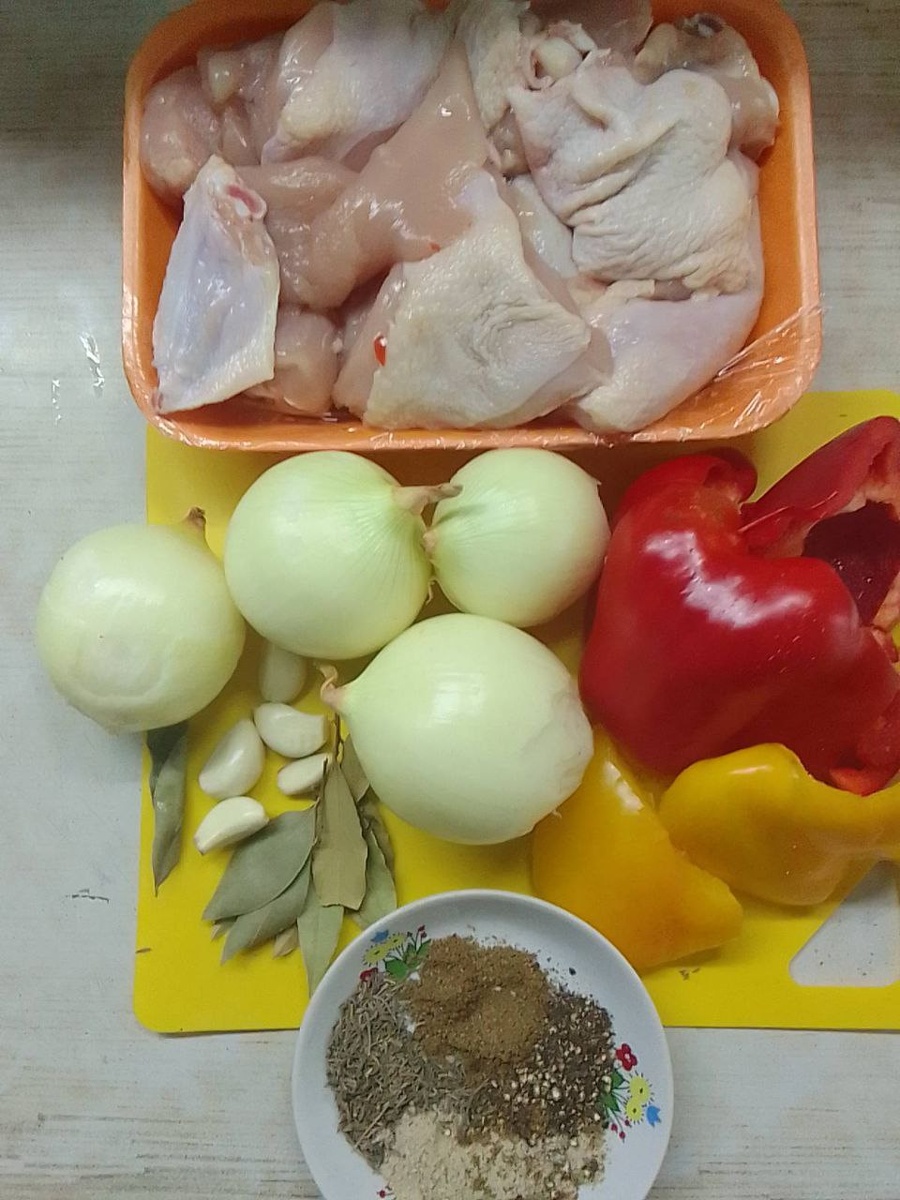1. Подготовка ингредиентов: курицу нарезать кусочками, лук и болгарский перец — соломкой. Подготовьте специальную баночку объемом около 2 литров.