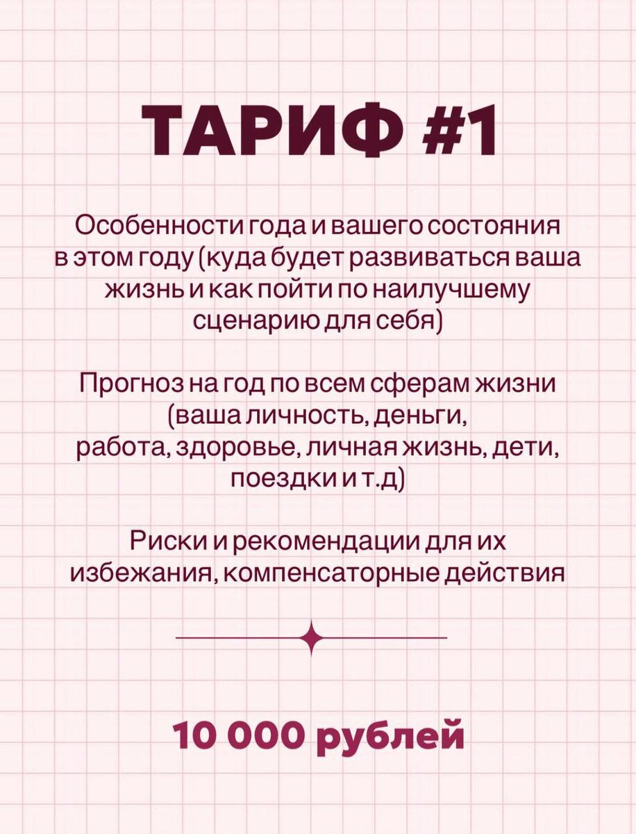 в 2️⃣ тарифах: 1️⃣ТАРИФ - подходит для тех, кому интересно узнать, что вас ждет; - тем, кто хочет держать свою жизнь под контролем; - для тех, кто хочет понимать - где подстелить соломки; 2️⃣ ТАРИФ - подходит для тех, кто проживает сложный период по одной из сфер жизни (хочет получить план); - для тех, кто хочет совершить прорыв по одной из сфер жизни или понять - как принять решение, которое будет наилучшим для него. 📍Для расчета Соляра понадобится 👉🏻 ваша дата, место и время рождения. СОЛЯР идеально заказать не только для себя, но и в ПОДАРОК 🎁 💴 Варианты оплаты 👇🏻 1. Внесение всей суммы сразу; 2. Оплата долями (3-4 платежа). ✍️ Рекомендую перед заказом написать мне лично (я подскажу, какой тариф в вашей ситуации подходит лучше всего) 👇🏻 @astrolog_belskaya 👌🏻 Но если же вы точно определились и хотите скорее занять свое место (быть одной из первых, кто получит свой прогноз), то скорее переходите по ссылке и выбирайте ТАРИФ 👇🏻 https://astrologbelskaya.ru/p/fe7f52