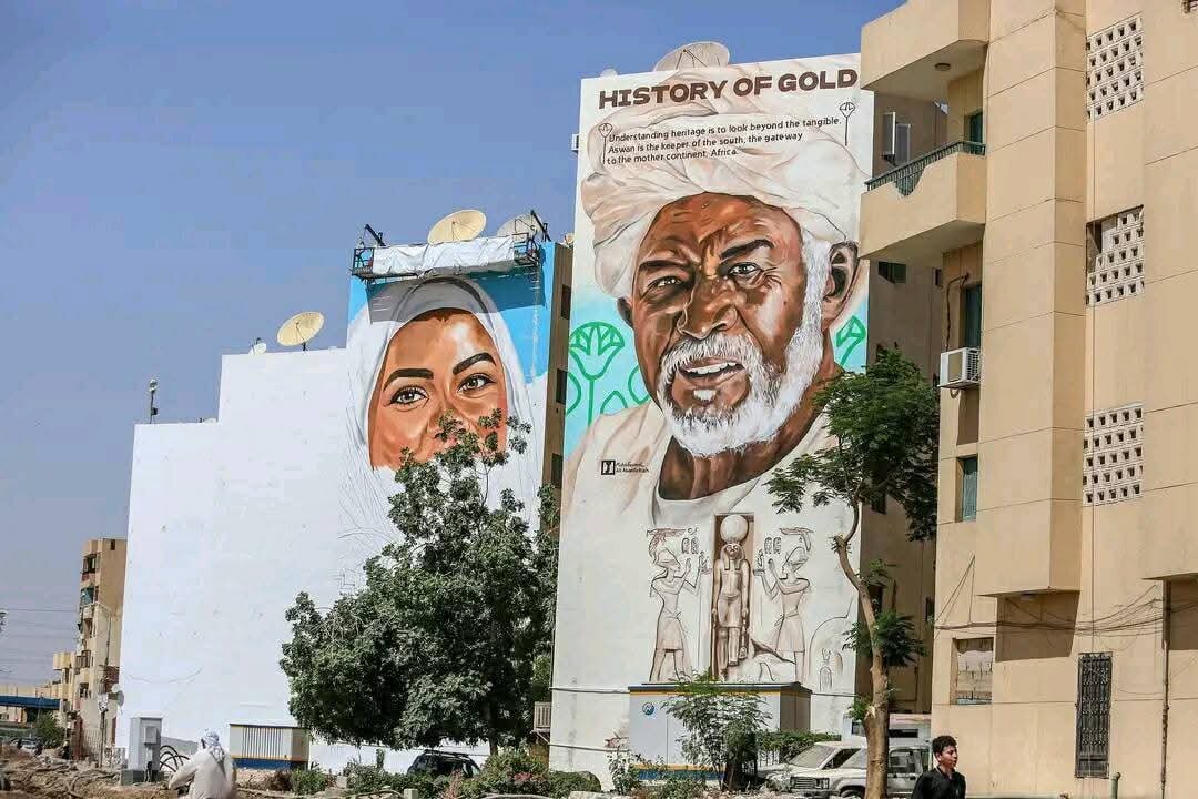 Ассуан украсили гигантские настенные панно: четыре жилых дома превратились в полотна. В египетском городе Ассуан стартовал уникальный художественный проект «Золотая земля», в рамках которого фасады четырёх многоэтажных домов были превращены в масштабные художественные панно. Инициатива реализована с целью развития культурного пространства города и визуального обновления одной из главных транспортных артерий — улицы Эс-Садат, ведущей к международному аэропорту. Авторство работ принадлежит известным ассуанским художникам — Махе Джамиль и Али Абдель-Фаттаху. Супруги не только стали инициаторами идеи, но и лично исполнили каждую из росписей. За их плечами — более пятнадцати лет работы в области монументальной живописи и участие в десятках художественных проектов. Их вклад был недавно отмечен на государственном уровне: в 2024 году пара получила Государственную премию в области изобразительного искусства. Каждая из четырёх росписей — это самостоятельная визуальная история, отсылающая к тради